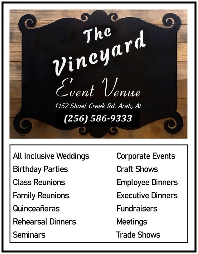 The Vineyard is the perfect mix of rustic, modern and elegant features for your traditional or nontraditional event or wedding. We are located just 30-minutes from south Huntsville nestled in a 16-acre landscape between Arab and Guntersville Alabama. The Vineyard offers four wedding space choices for ceremonies and a large beautiful reception facility. In addition, we have a wide selection of decorations on-hand that can be used to customize your event. The Vineyard caters to a wide range of non-wedding events including family and school reunions, corporate events, bridal showers, elopements or engagement party, executive dinners, employee dinners, seminars and is the perfect location for a quinceanera.