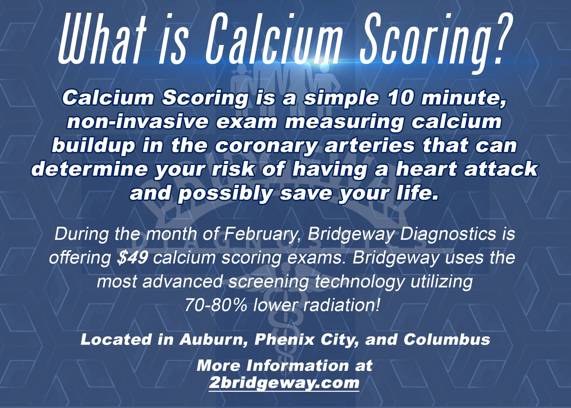 Bridgeway Diagnostics is a physician owned diagnostic radiology practice providing a full range of screening and diagnostic imaging services. Our mission is to provide state-of-the-art equipment in a comfortable and secure environment to get you the most precise diagnosis while providing you peace of mind. We prioritize both accuracy and patient experience and we have the cutting edge technology to prove it. We want to be part of your healthcare team and we work closely with your physician to help develop the best diagnosis and treatment plan.