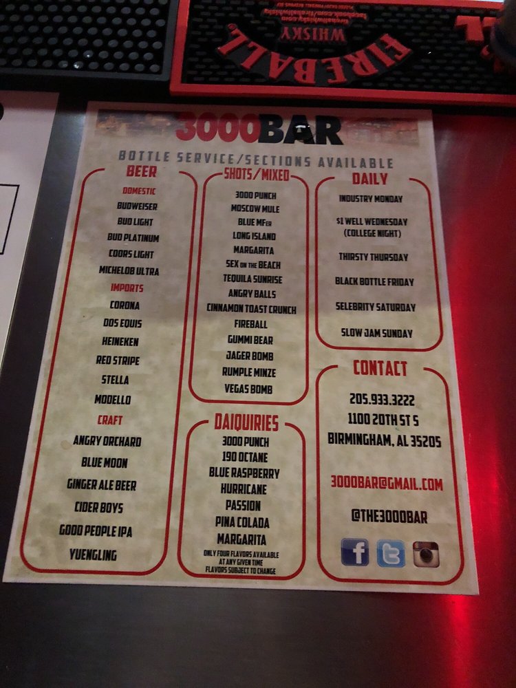 3000 Bar is a small, welcoming establishment with a cool vibe and a relaxing atmosphere. Located in downtown Birmingham among other bars, it offers a convenient spot for barhopping. The place is wheelchair accessible, including the bar and restrooms. The staff, including helpful and accommodating bartenders, provide great service and make guests feel comfortable. The atmosphere features relaxing R&B music, creating a perfect setting to unwind after a long day or road trip. Customers enjoy the hookahs, drinks, and daiquiris, which are described as amazing, though slightly on the expensive side. The bar tends to be less busy during weekdays, making for a laid-back experience. It is a black-owned business, adding to its appeal. Overall, visitors find it to be a great place to enjoy good company, better vibes, and quality drinks in a cozy environment. Many plan to return, highlighting the friendly service and inviting atmosphere as key highlights.