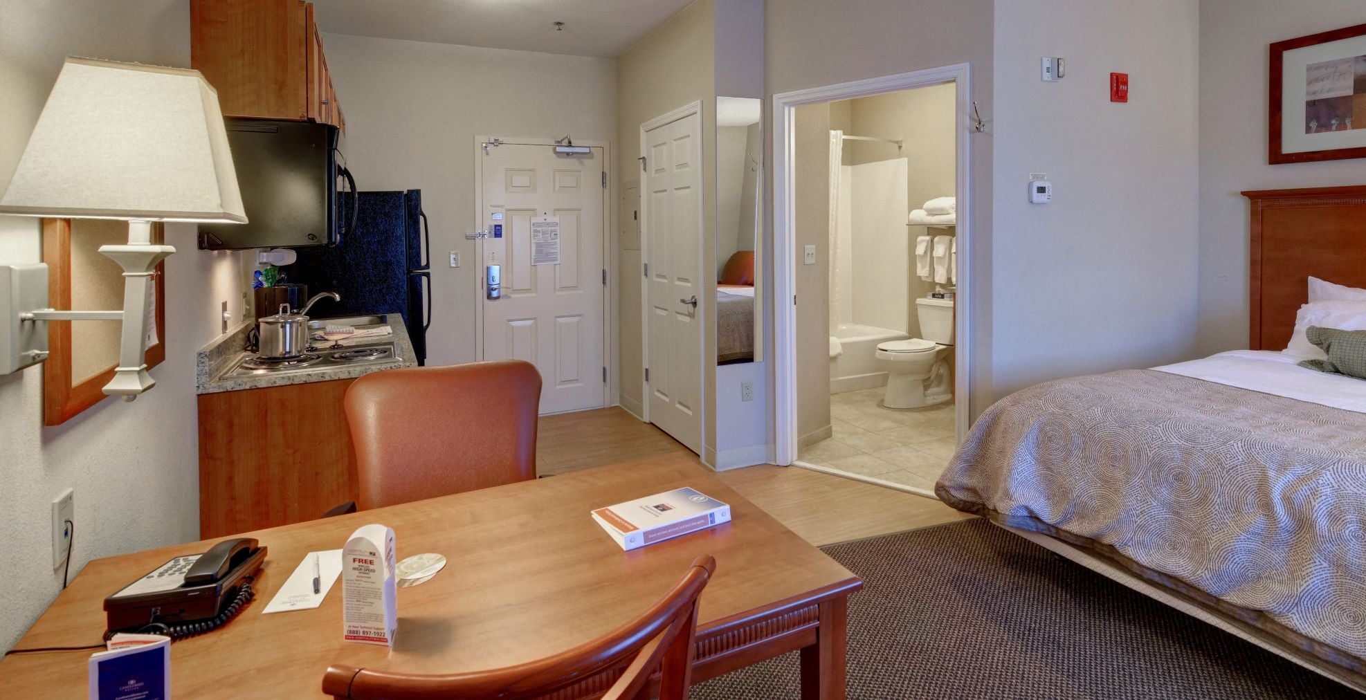 Clean room. Spacious room with a full kitchen was nice. Staff friendly. Quiet and secluded but still near everything. Will be back