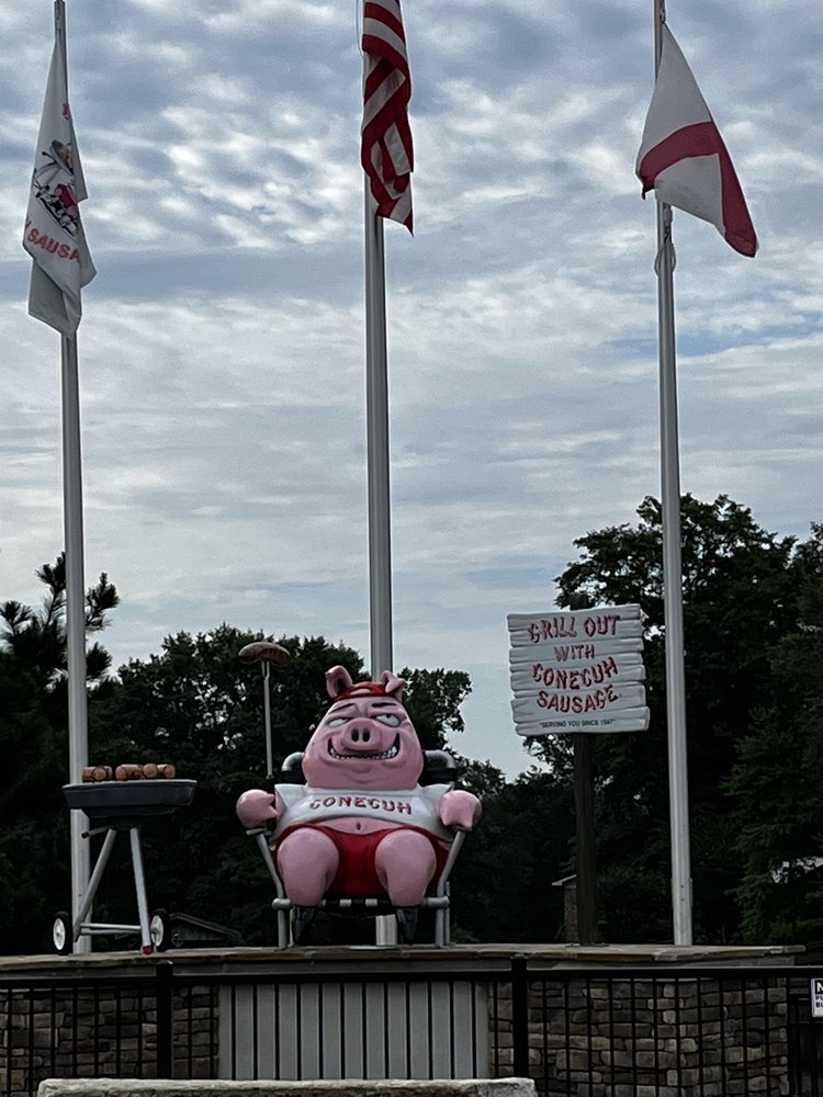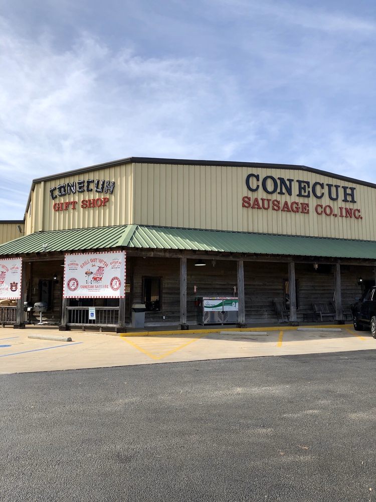 Conecuh Sausage Co. is known for its high-quality, hickory smoked meat products, including smoked sausage in six varieties, premium frankfurters, sliced and slab bacon, whole hams, and turkeys. Customers frequently stop by for breakfast sandwiches, hot sausages, cracked black pepper sausages, and thick-cut sliced bacon at reasonable prices, often bringing coolers for their purchases. The establishment is praised for being very clean, with friendly staff who offer helpful service at the sausage bar. Visitors can enjoy outdoor seating with heaters, as well as a variety of meats in the fridge and freezer, including big packages of sausage, hams, smoked turkeys, and Christmas sausage. The shop also features a gift shop, sells deer corn and attractants for hunters, and provides amenities like clean restrooms, coffee, hot dogs, and drinks. Customers appreciate the quality of the meats and the excellent customer service, with some traveling long distances or even shipping products to loved ones. Overall, Conecuh Sausage Co. offers a welcoming environment to eat, shop, and stock up on Bama’s best sausage and meats.