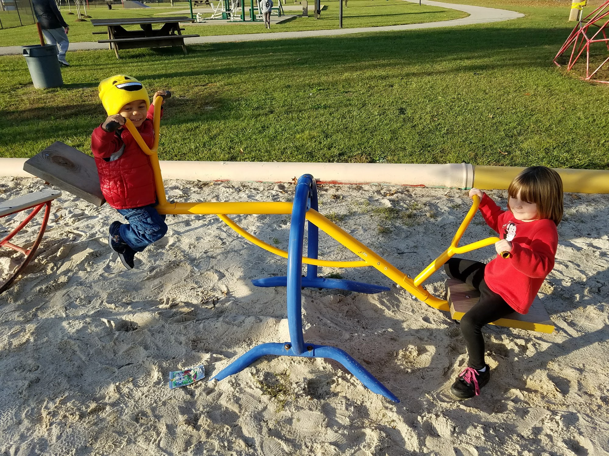 Wonderful park! Play ground for the kids and a walking path.Playground: Newly renovatedDog-friendliness: On leash friendlyPicnic area: Covered