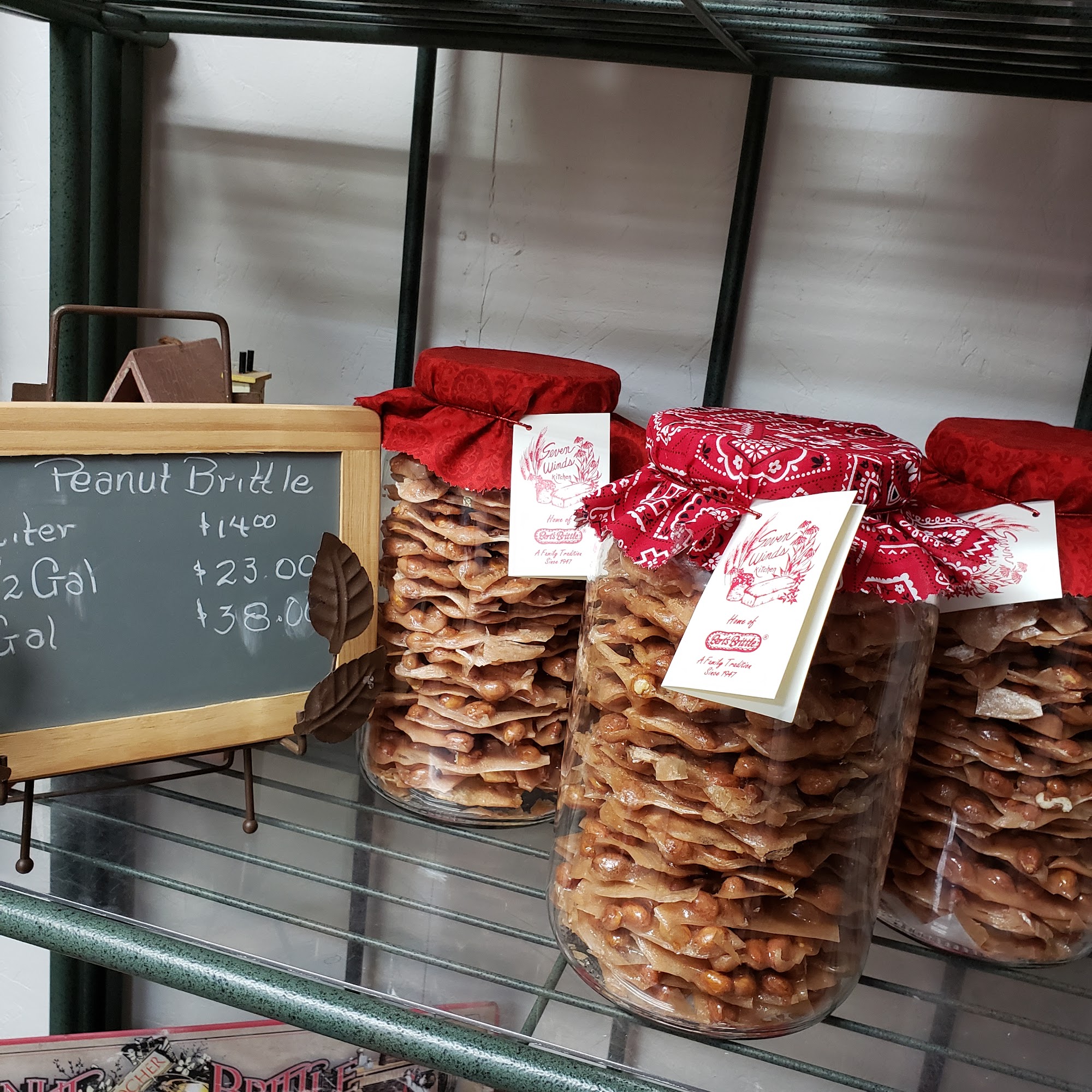 Seven Winds Kitchen and Gift Shop is celebrated for its exceptional peanut brittle, which many customers describe as the best they've ever tasted. In addition to the brittle, the shop offers a variety of homemade goodies, including cookies, jellies, and sweet potato pie. The kitchen focuses on homemade and locally sourced foodstuffs, with popular items like squash pickles. While the shop also features gifts, some reviews suggest that the kitchen should take center stage. Customers appreciate the thoughtfulness in shipping products across the country and express enthusiasm for returning to try more treats. Despite a few mixed opinions on the gift shop aspect, the kitchen's offerings have garnered strong praise and loyalty from visitors.