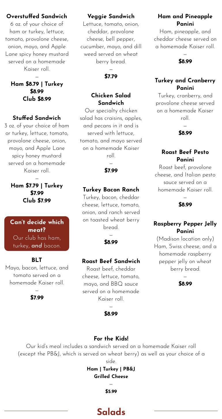 Apple Lane makes the best stuffed sandwiches! I've never got food there and left feeling not filled up or unsatisfied. The ingredients are fresh they use and the staff is very friendly. Delicious food. I recommend them!
