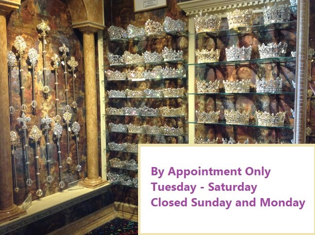 Tuesday - Saturday....Appointment Only....At Dynasty Collection, we design and make King crowns, Queen crowns, scepters, tiaras, tiaras for brides, debutantes and returning Queens, jewelry and rhinestone name pins. Dynasty Collection uses the finest Swarovski crystal stones and our gold and silver finish is of the highest quality.