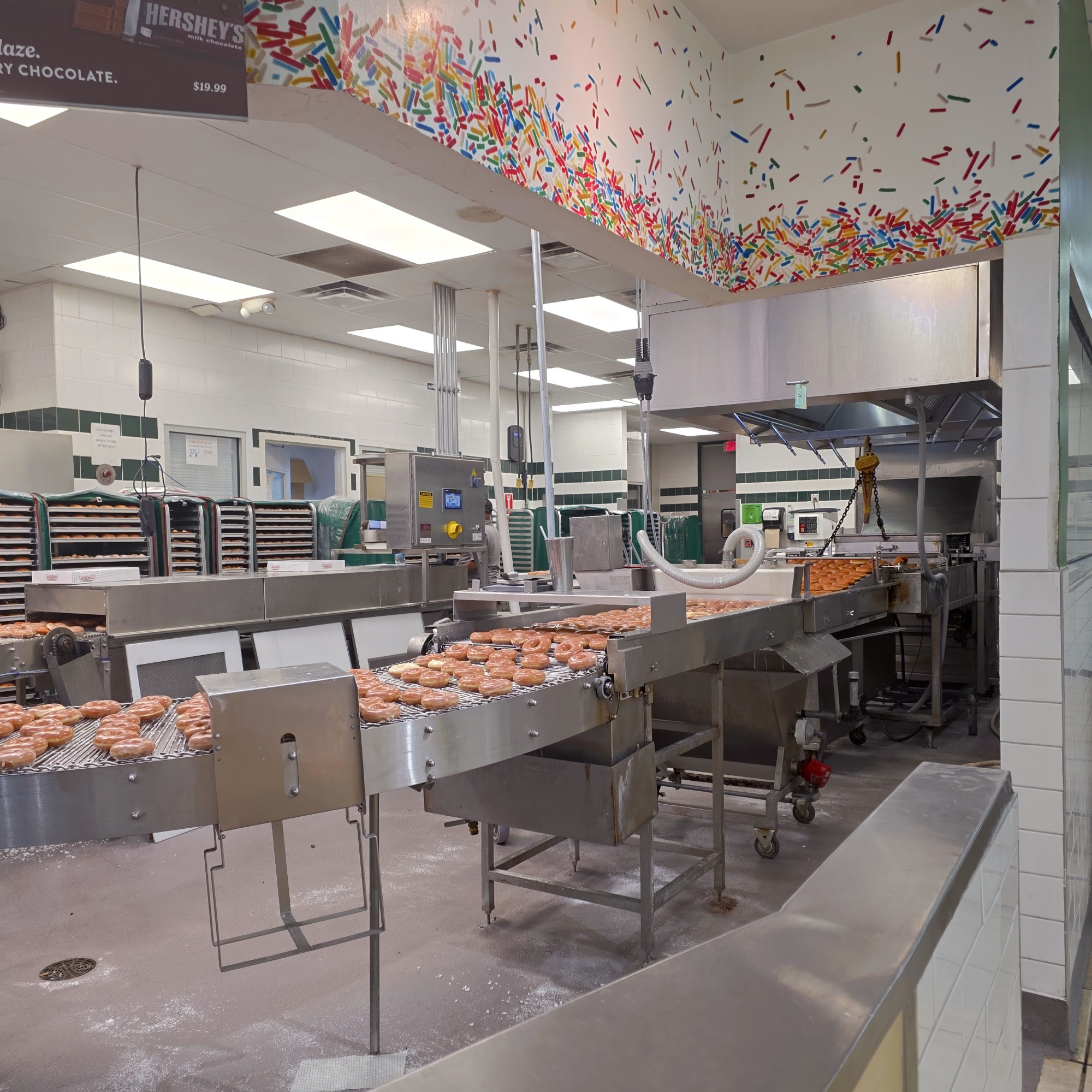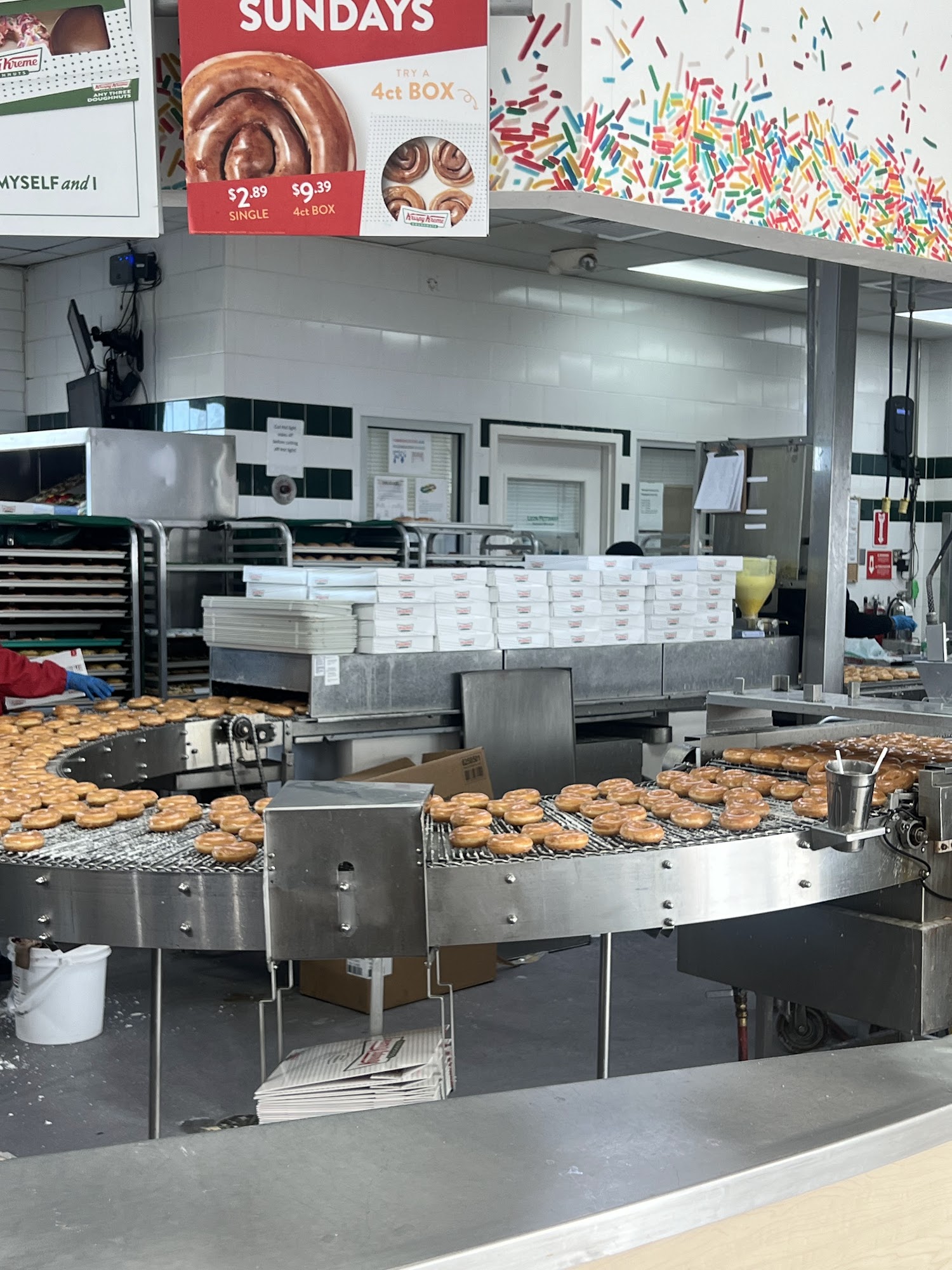 Coffee machine has been broke for a while, but when the hot sign is on. You HAVE to stop and get a box, and watch the magic happening on the conveyor belt.