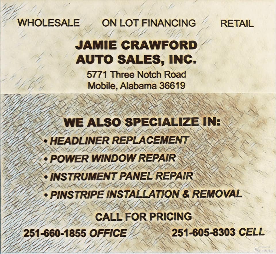 Established in 2001: Jamie Crawford Auto Sales, Inc. is a family owned and operated, buy here - pay here, used car dealership. We also specialize in headliner replacement, power window repair, instrument panel repair, pinstripe installation & removal, light duty mechanic work, and Notary Public service.