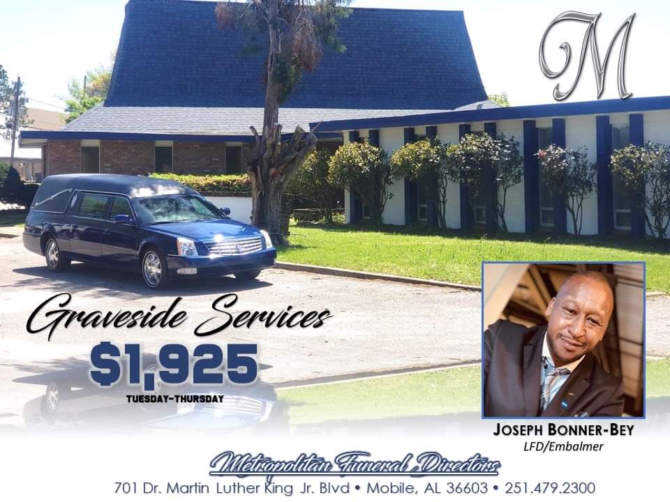 Metropolitan Funeral Directors, formally Tristate Mortuary Services have been serving families since 2007. Our owner and Mortician has been licensed with the Alabama Board of Funeral Service as a Funeral Director since 2007, as a Licensed Embalmer, since 2019 and more recently this year, he was licensed as a Cremationist. He is also licensed as a Funeral Director and Embalmer in the state of Mississippi and he has been bestowed the credentials of Certified Funeral Service Practitioner (CFSP) by the Academy of Funeral Service Practice. His experience that he brings to Metropolitan Funeral Directors, equip our establish with the tools, necessary to serve your family. Dr. Joseph Bonner-Bey, CFSP, is a member of the NFDM&A and AFDM&A.