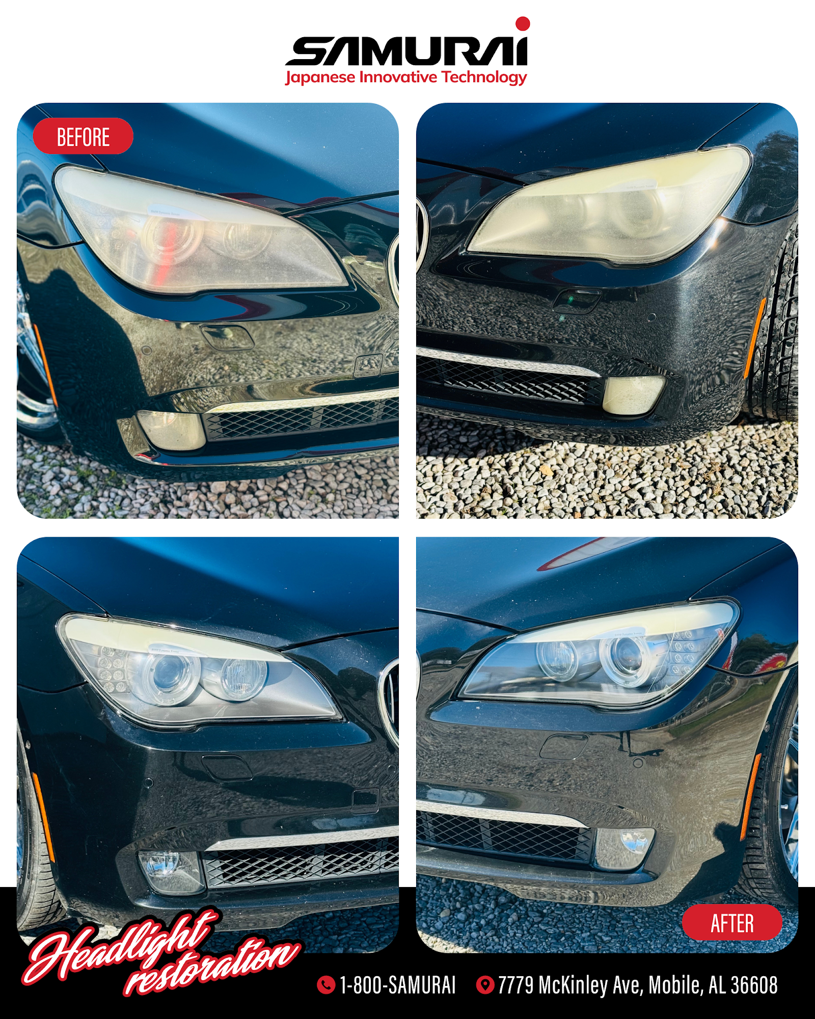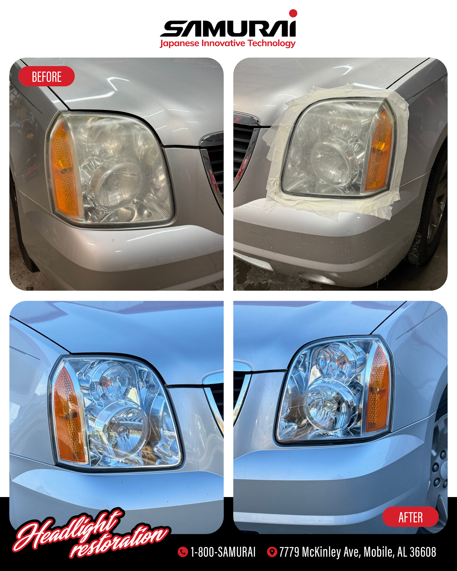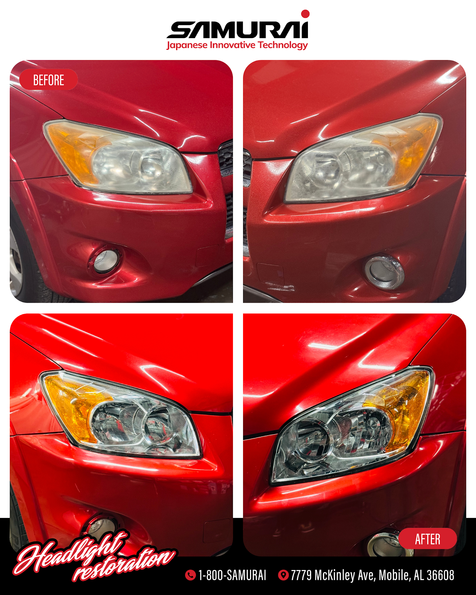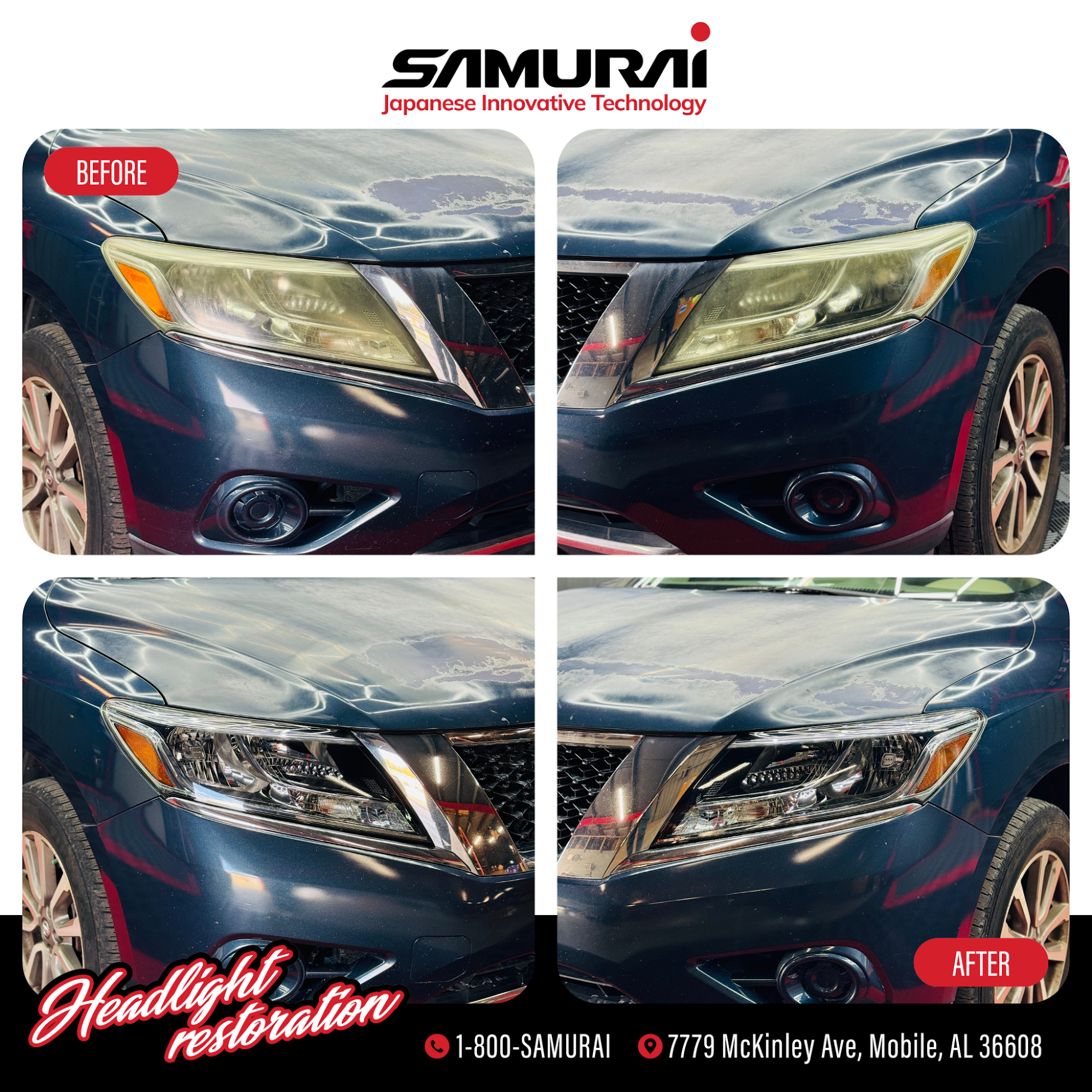 SAMURAI Headlight Restoration and Window Tinting is the best service provider for those who are looking for the highest value for professional headlight restoration without sacrificing convenience and customer service from Japanese Innovative Technology. We are a dynamic and skilled team of auto detailing professionals who pride ourselves on our ability to provide detailed, valuable work to restore headlights to their original luster. We offer headlight restoration and Window tinting services across the Mobile AL surrounding areas.