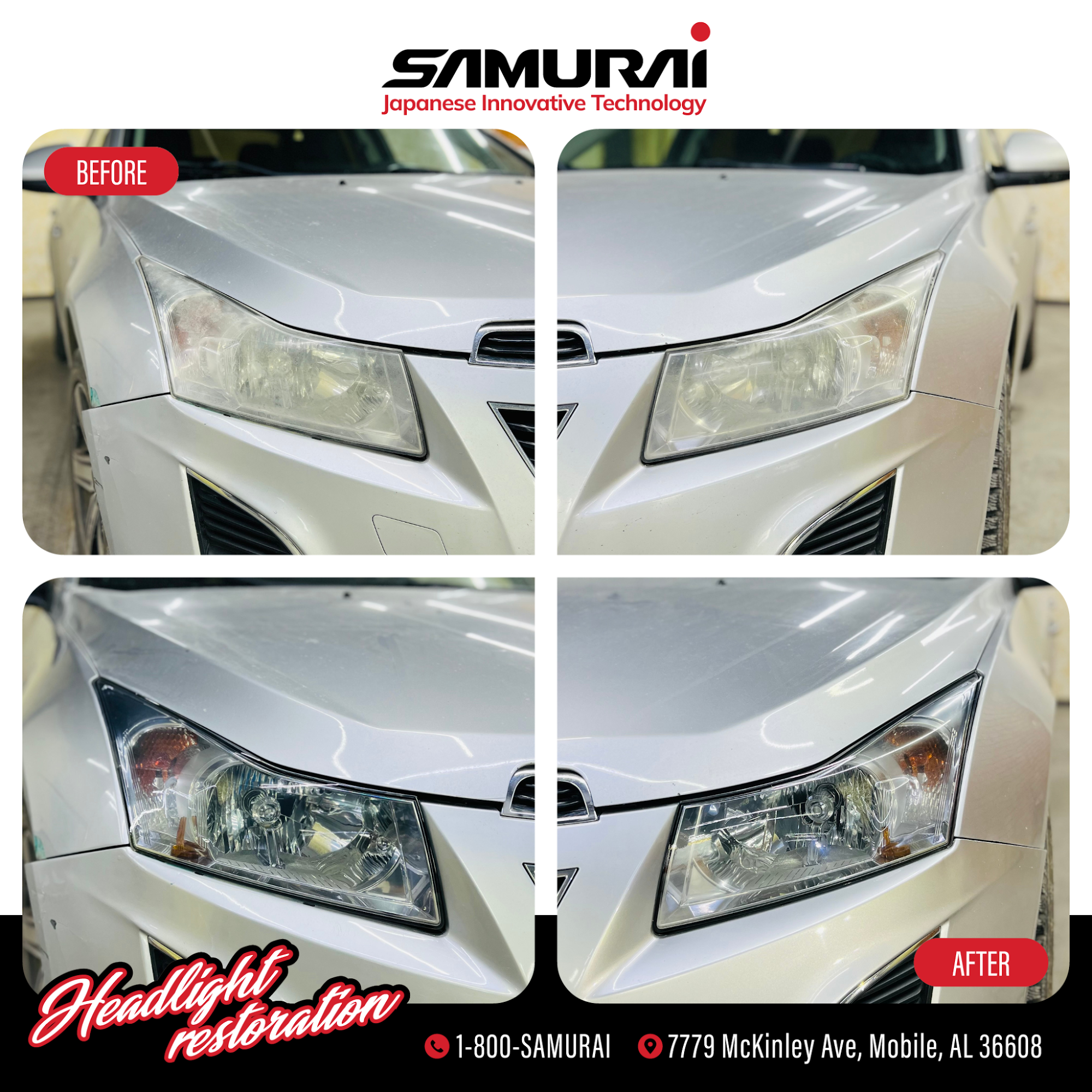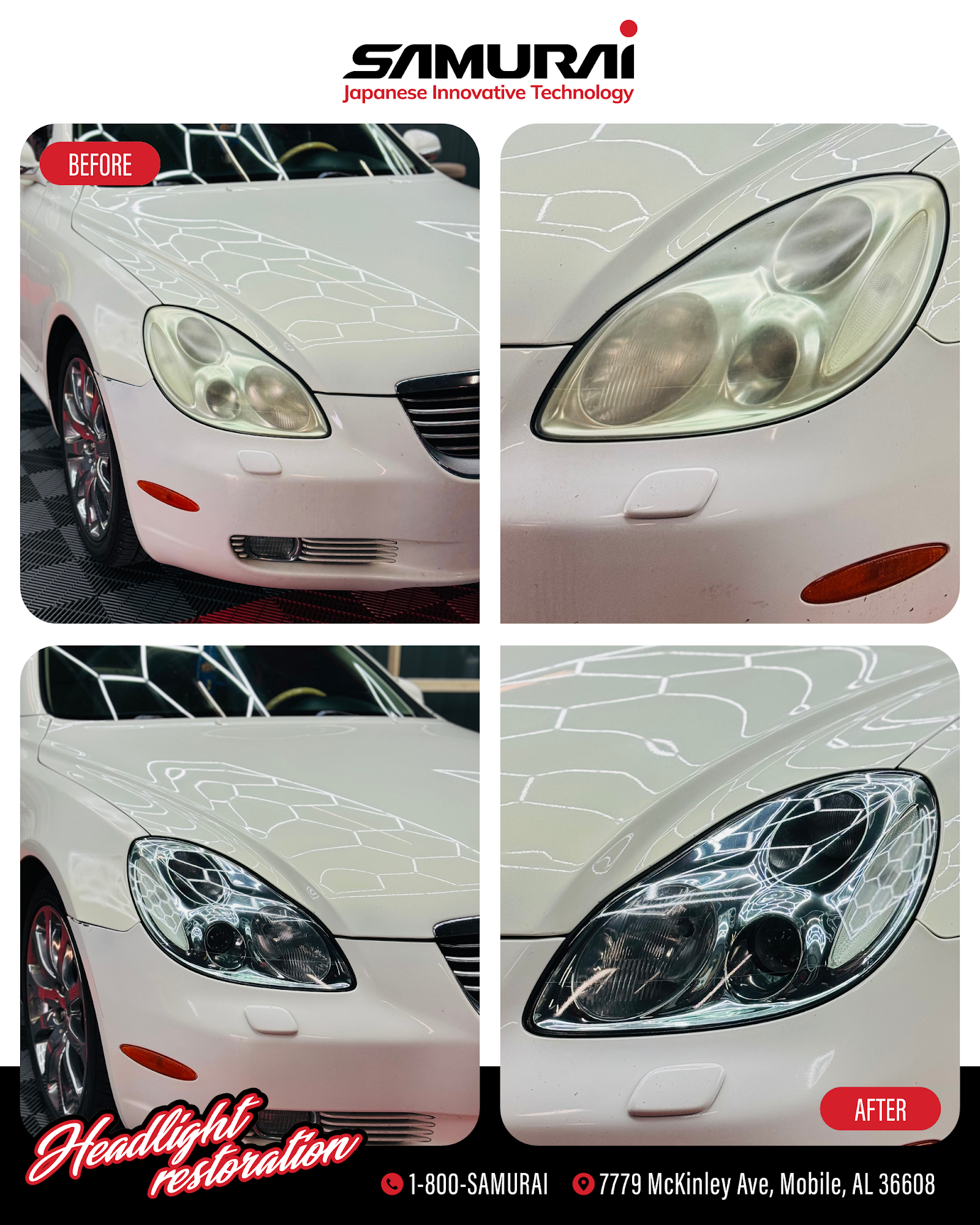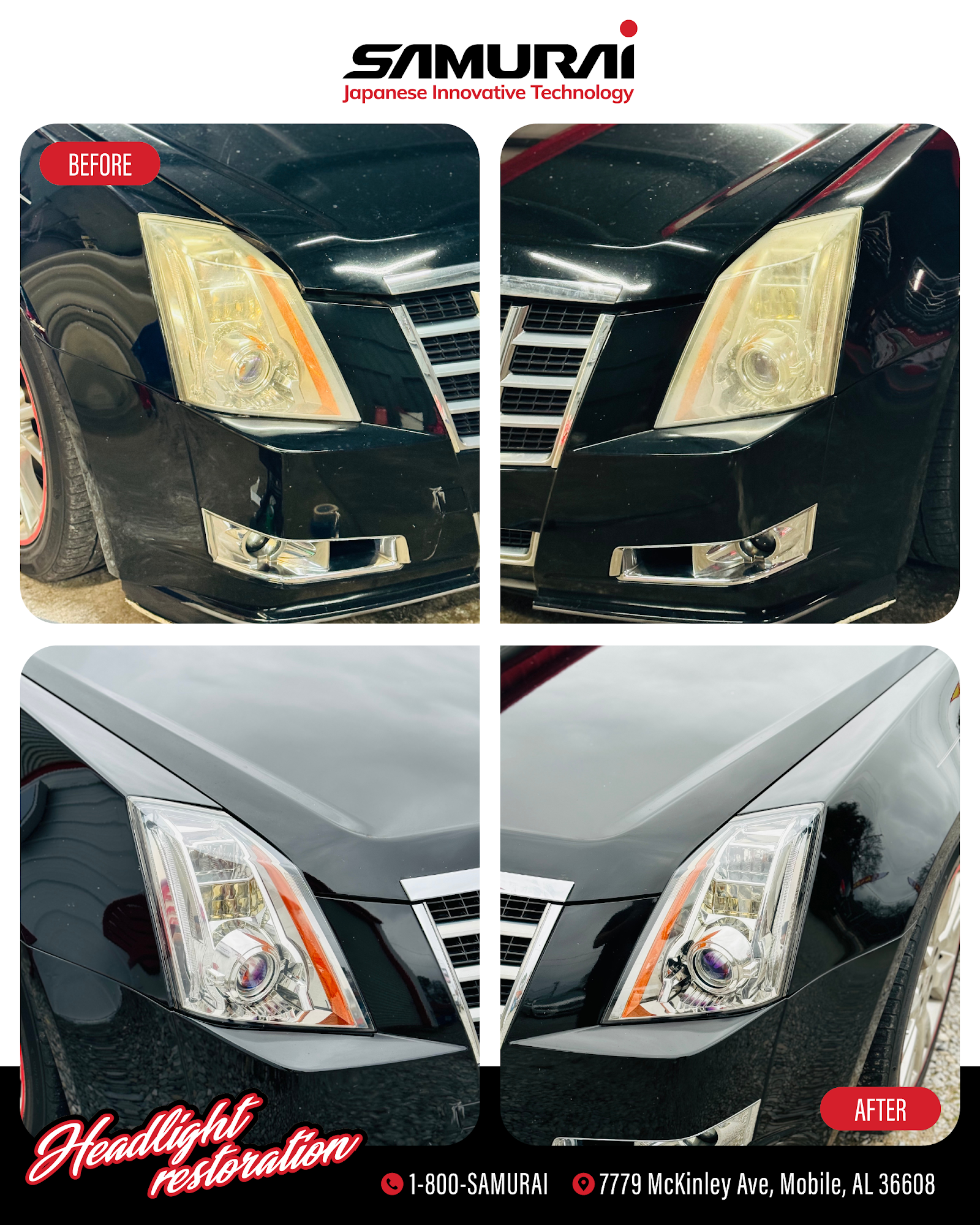 SAMURAI Headlight Restoration and Window Tinting is the best service provider for those who are looking for the highest value for professional headlight restoration without sacrificing convenience and customer service from Japanese Innovative Technology. We are a dynamic and skilled team of auto detailing professionals who pride ourselves on our ability to provide detailed, valuable work to restore headlights to their original luster. We offer headlight restoration and Window tinting services across the Mobile AL surrounding areas.