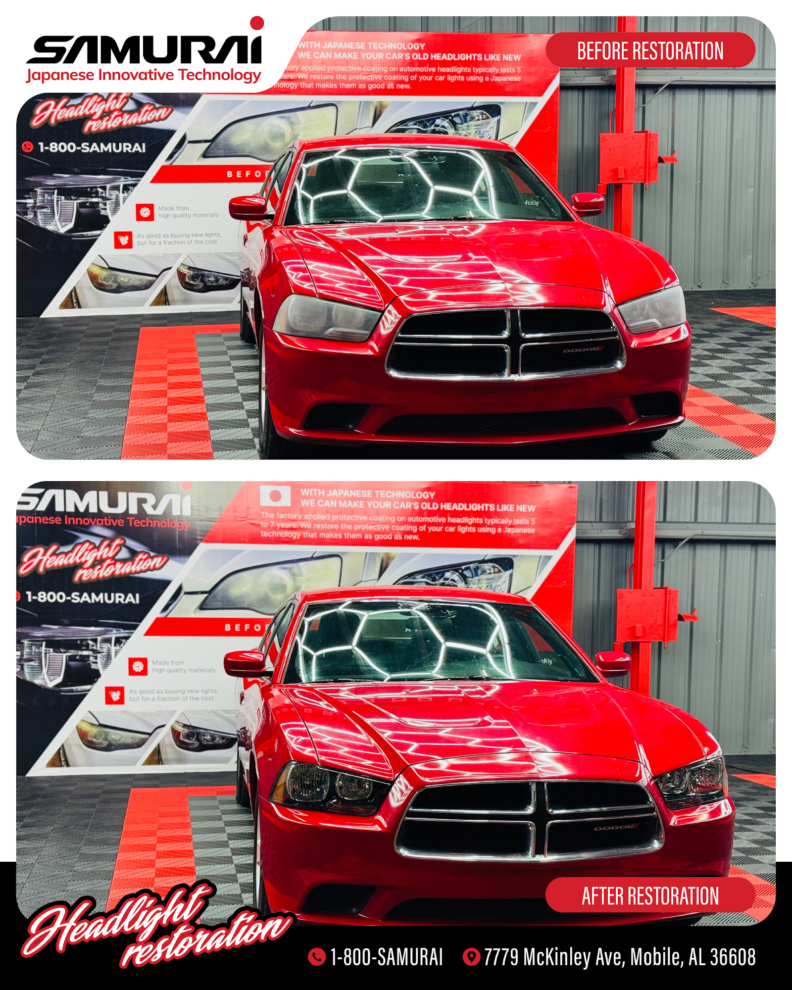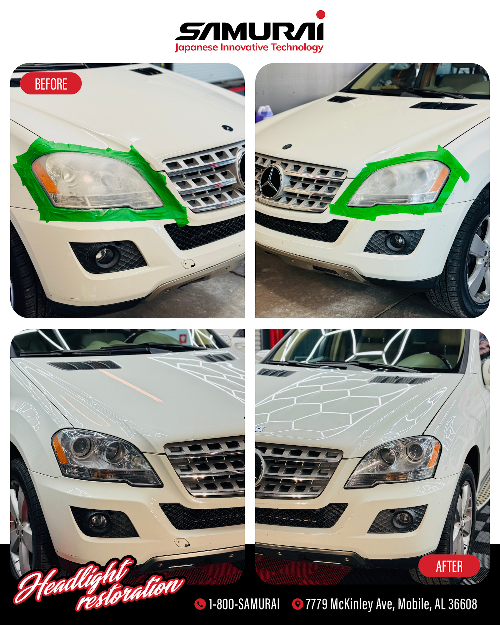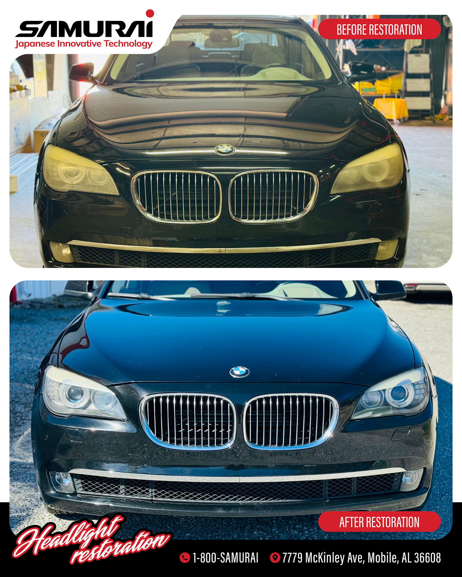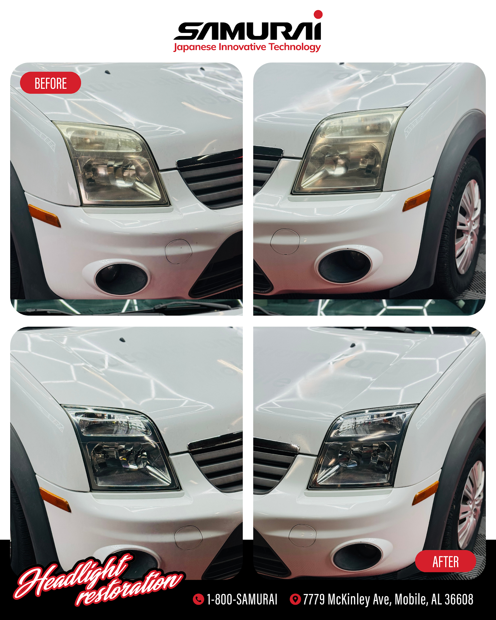 SAMURAI Headlight Restoration and Window Tinting is the best service provider for those who are looking for the highest value for professional headlight restoration without sacrificing convenience and customer service from Japanese Innovative Technology. We are a dynamic and skilled team of auto detailing professionals who pride ourselves on our ability to provide detailed, valuable work to restore headlights to their original luster. We offer headlight restoration and Window tinting services across the Mobile AL surrounding areas.