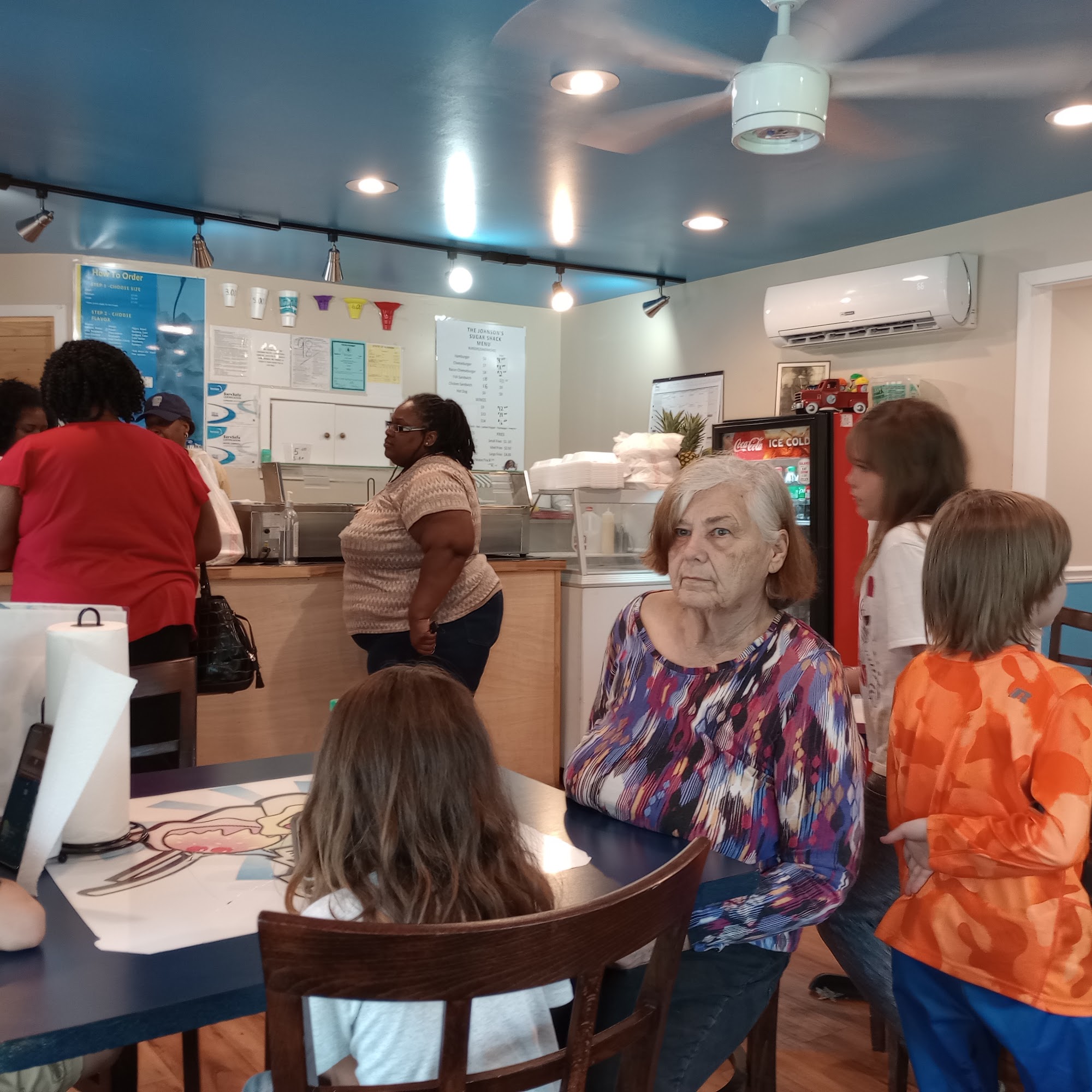 Charge $2 fee for using credit card.Kids enjoyed snow cones.Chicken sandwich is 2 chicken strips.Kids liked cheeseburger and pork chops.Not the chicken or crinkle french fries.Staff was friendly...kinda like we were in their house and not at a restaurant.Bathrooms were clean.