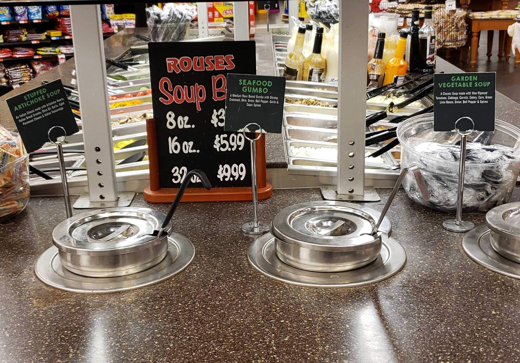 Love the hot food bar and the sea food in the back .Also have the best prices on cooked and fresh seafood that I have seen ,would rather grad a bag to take home ,then go set in a restaurant and wind up not happy with it.Always get full from Rouses hot bar.