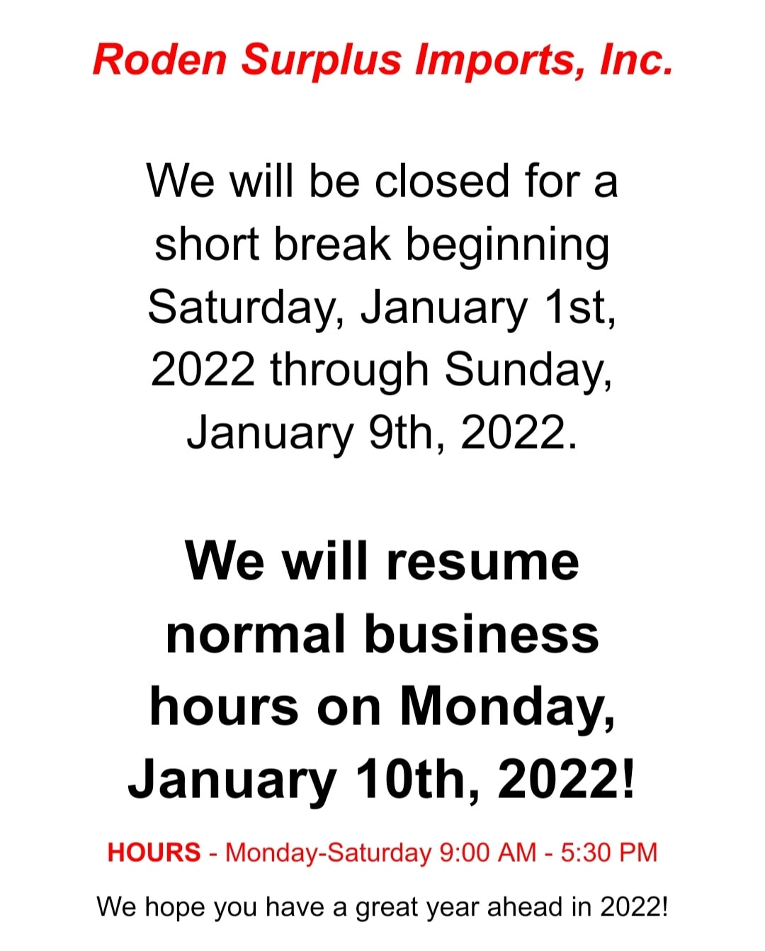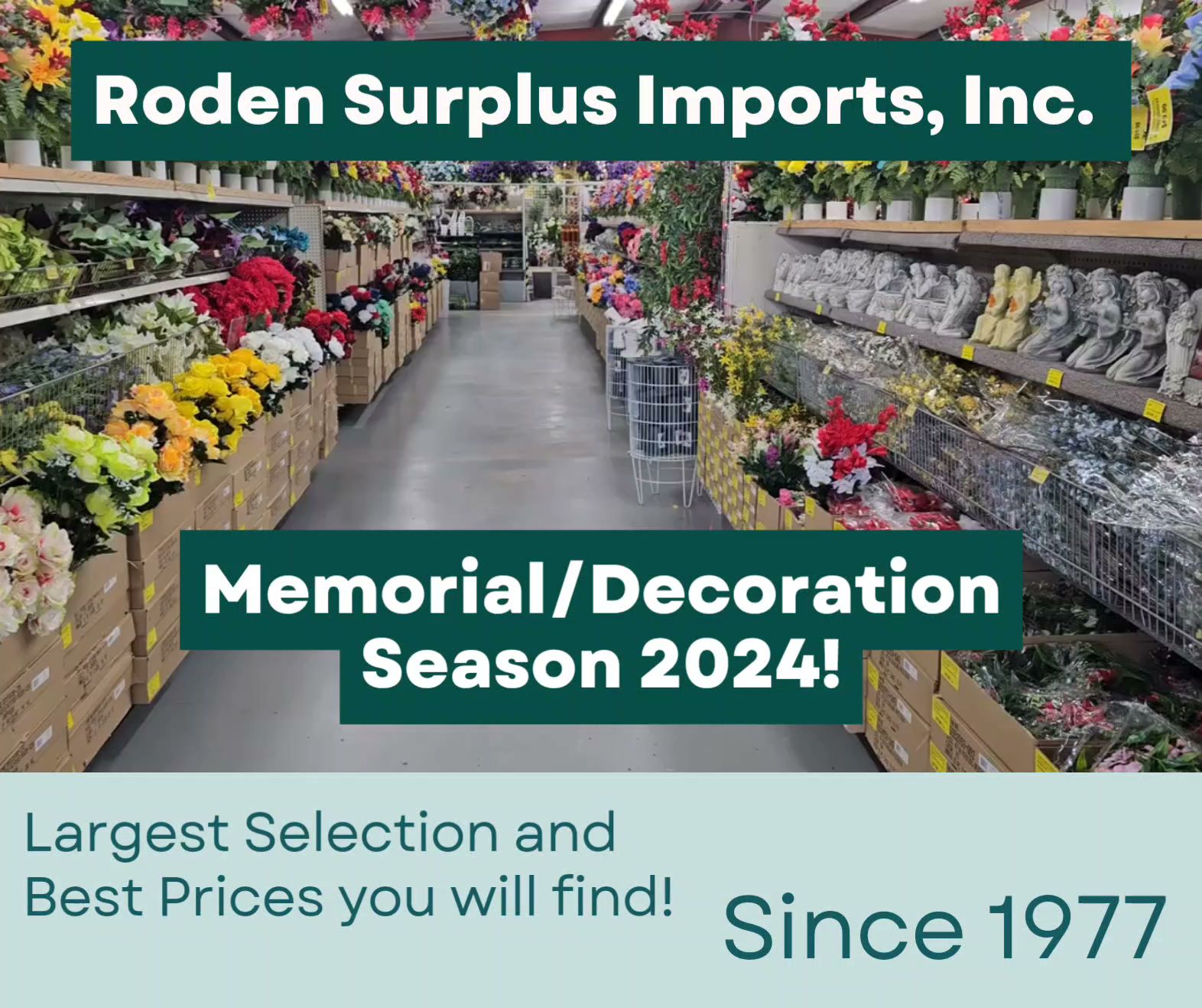 Roden Surplus Imports Inc. is a great affordable place where things ease mind and prices ease wallet. The best customer service ever, they take time to help with a smile. Really good merchandise and great prices, with a variety of items especially the Christmas section. Beautifully flower arrangements and items with amazing grace are in a huge selection. Prices are very fair and cheap, and they won't be disappointed for stopping and shopping around. Allow plenty of time to shop, as it is not a store they can just run in and out real quick.