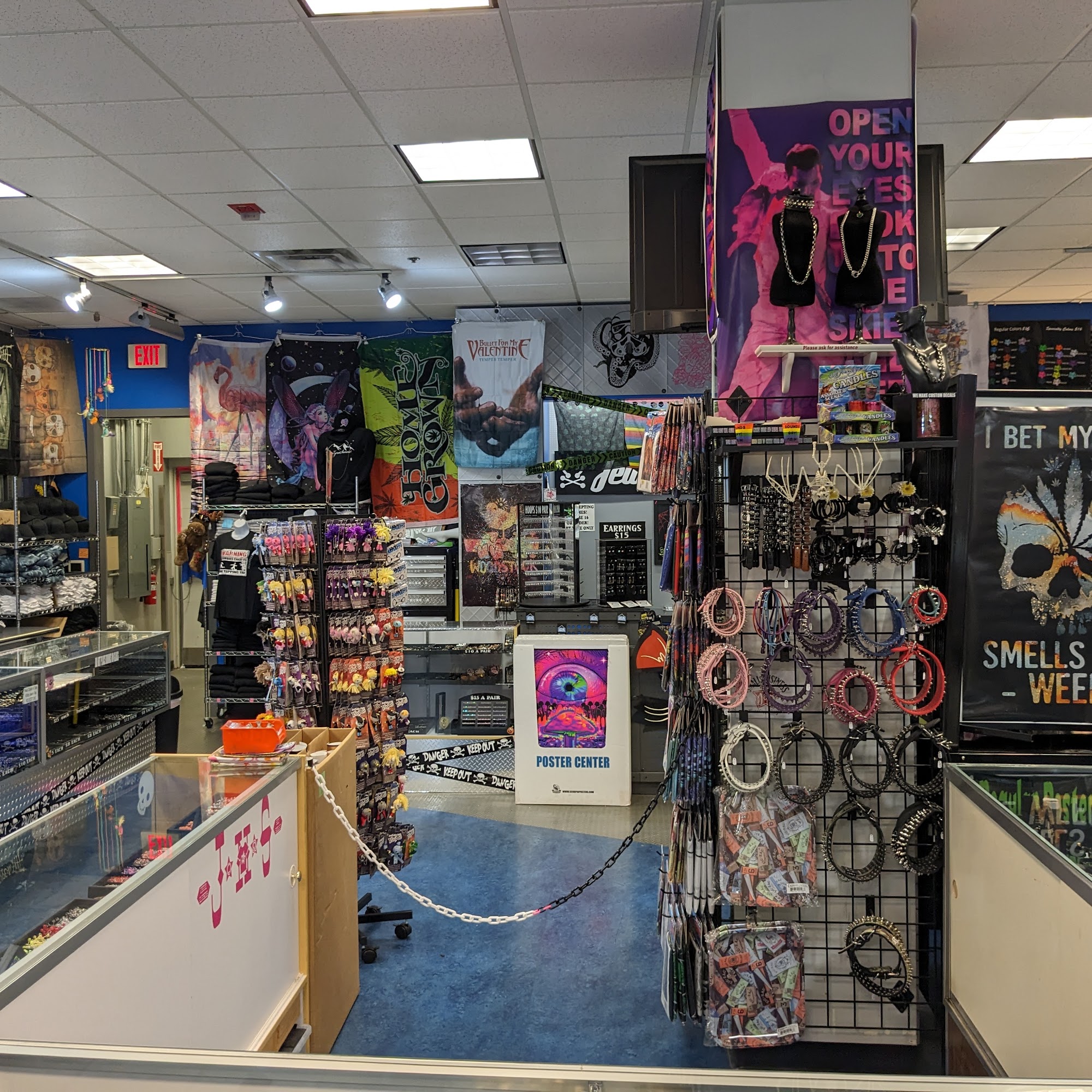 This was my first visit to this store ever they had cool tapestries posters stickers jewelry and stuff bumper stickers and prices seemed to be decebtv