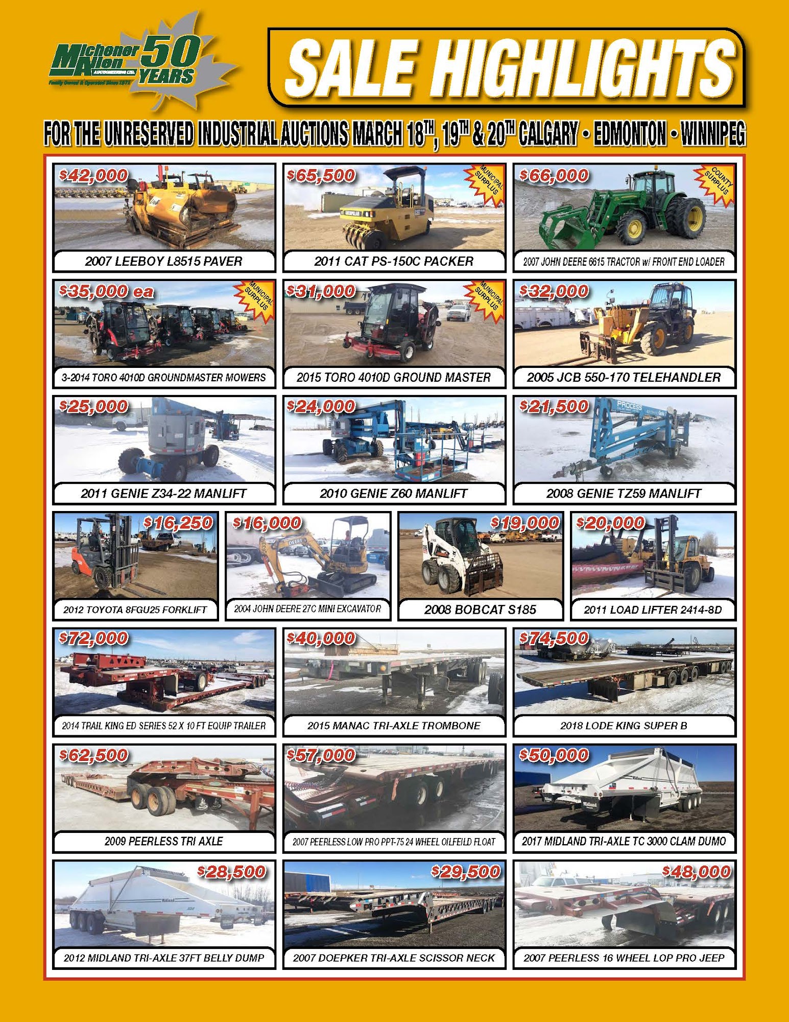 We are a family owned and operated auction business with 3 generations working together building and expanding our business every day. For over 50 years we have been open to the public for Industrial Equipment, Automotive and RV Auctions. Our head office in Edmonton opened in 1971 with our Calgary location opening in 1999 and then expanding to Winnipeg in 2010. We pride ourselves in the trust and confidence that so many of our long-term and brand new clients have put in us as we continue to bring buyers and sellers together in an exciting and transparent process.