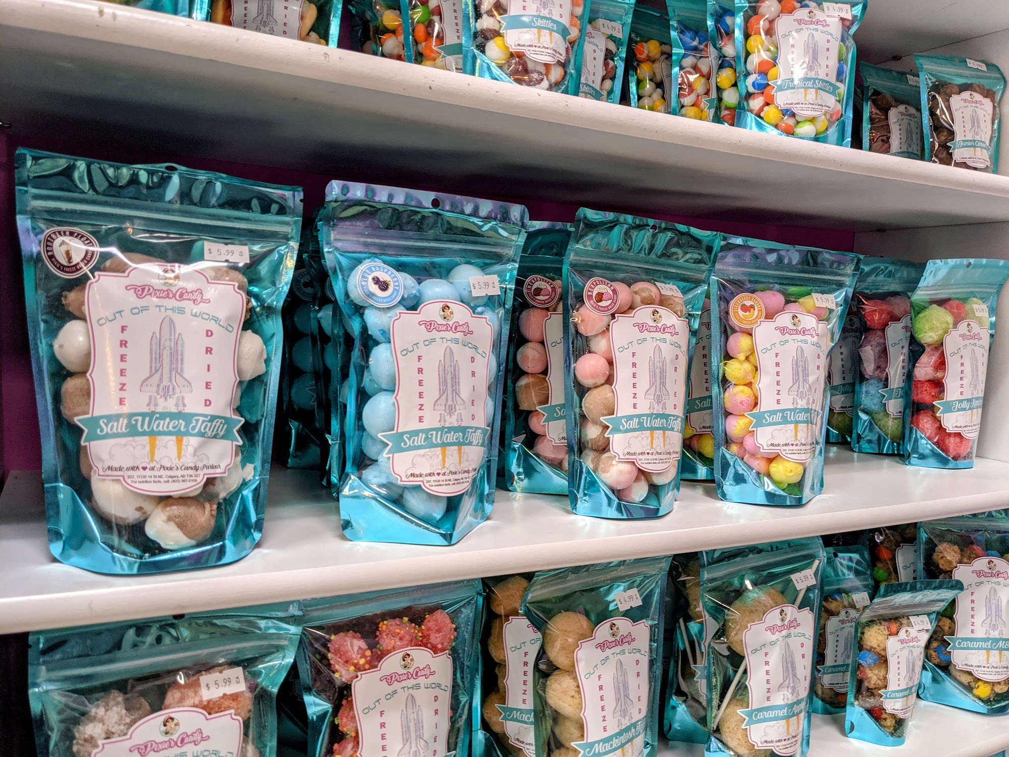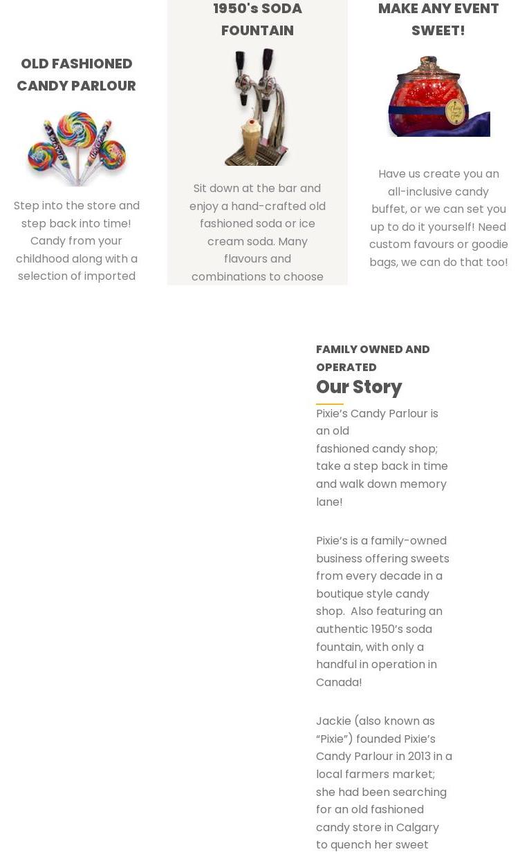 Pixie's Candy Parlour is a family owned and operated neighbourhood candy store that invites you to step back in time. The shop carries a really diverse and wide selection of candy and chocolate from around the world, including the largest selection of Mexican candy in Calgary and lots of retro candy. They are known for their unique imported and hard to find imported candy, and everything is always really fresh. The store makes its own freeze dried candy, tasty fudge, and spins its own cotton candy. A rare and cool unique feature is a refurbished 1950's soda fountain, where they hand-craft authentic old-fashioned sodas and floats right in front of you. Adding phosphate to the sodas is a wonderful surprise in flavour. The shop is cute and the prices are good. The owners are always incredibly friendly and welcoming, creating a wonderful experience. Customers are never disappointed and many would definitely make a special drive to visit again. It is everything you want in a candy store.
