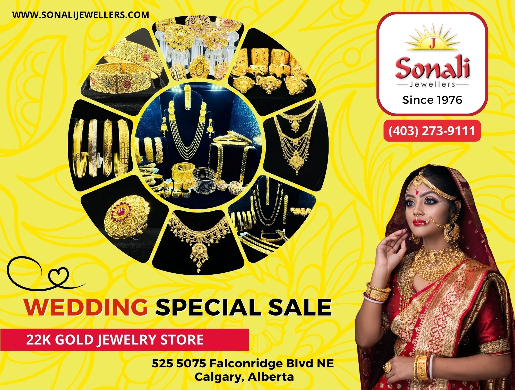 Sonali Jewellery Limited has been and remains to be a prominent name in the jewellery business in Calgary since 1976. Sonali had humble beginnings and is now the largest 22kt specialty jewellery store in Alberta. Family owned and operated, Sonali has grown up with the South Asian community in Calgary. Sonali is a family owned business with the experience of three continent and four generation in business. From head to toe, Sonali offers jewellery for all occasions. We offer an enormous variety of wedding sets and bangles in a variety of finishes. We offer Gold, Diamond, and Silver jewellery and have full manufacturing facilities on site for all custom work and repairing.