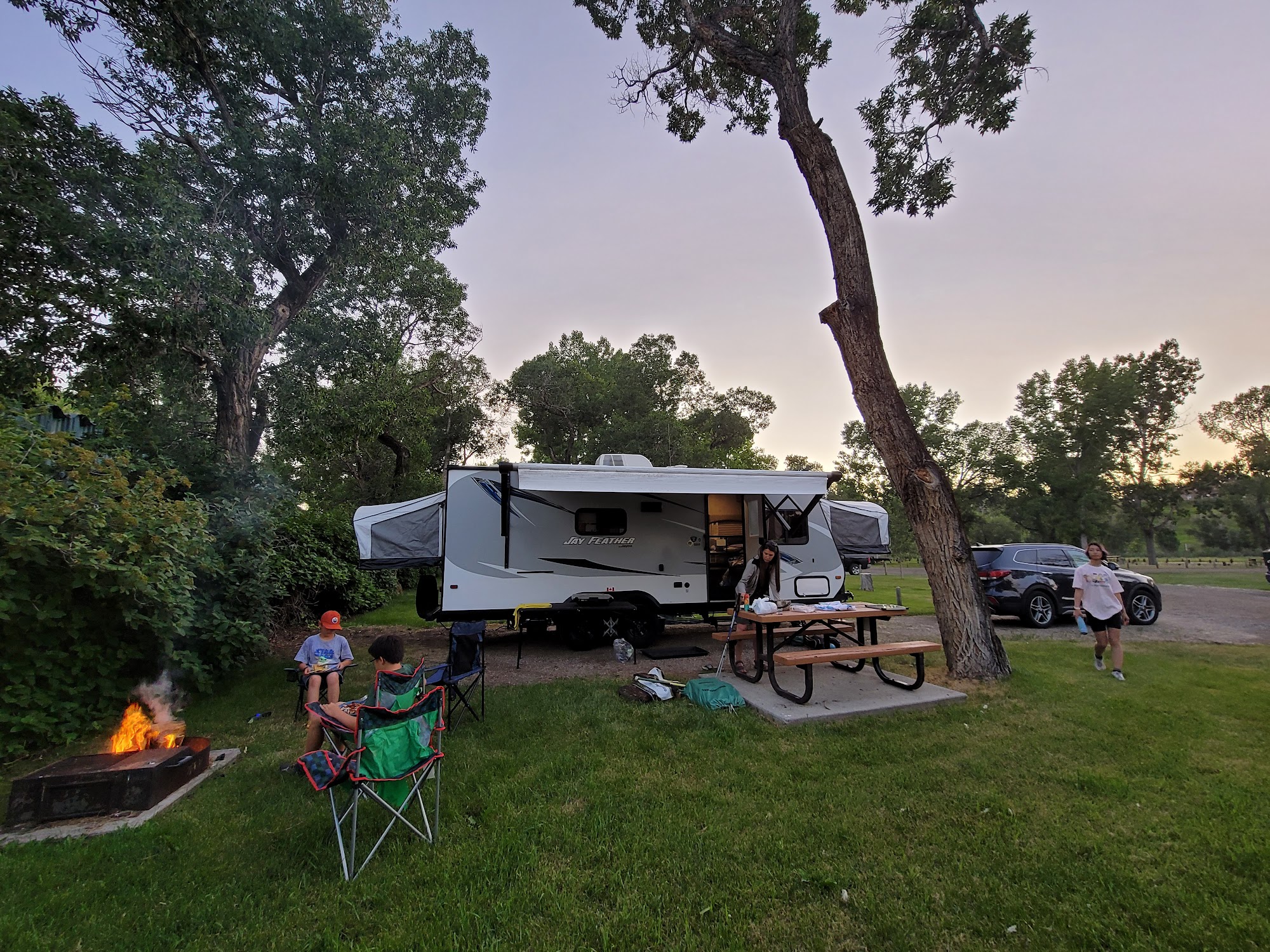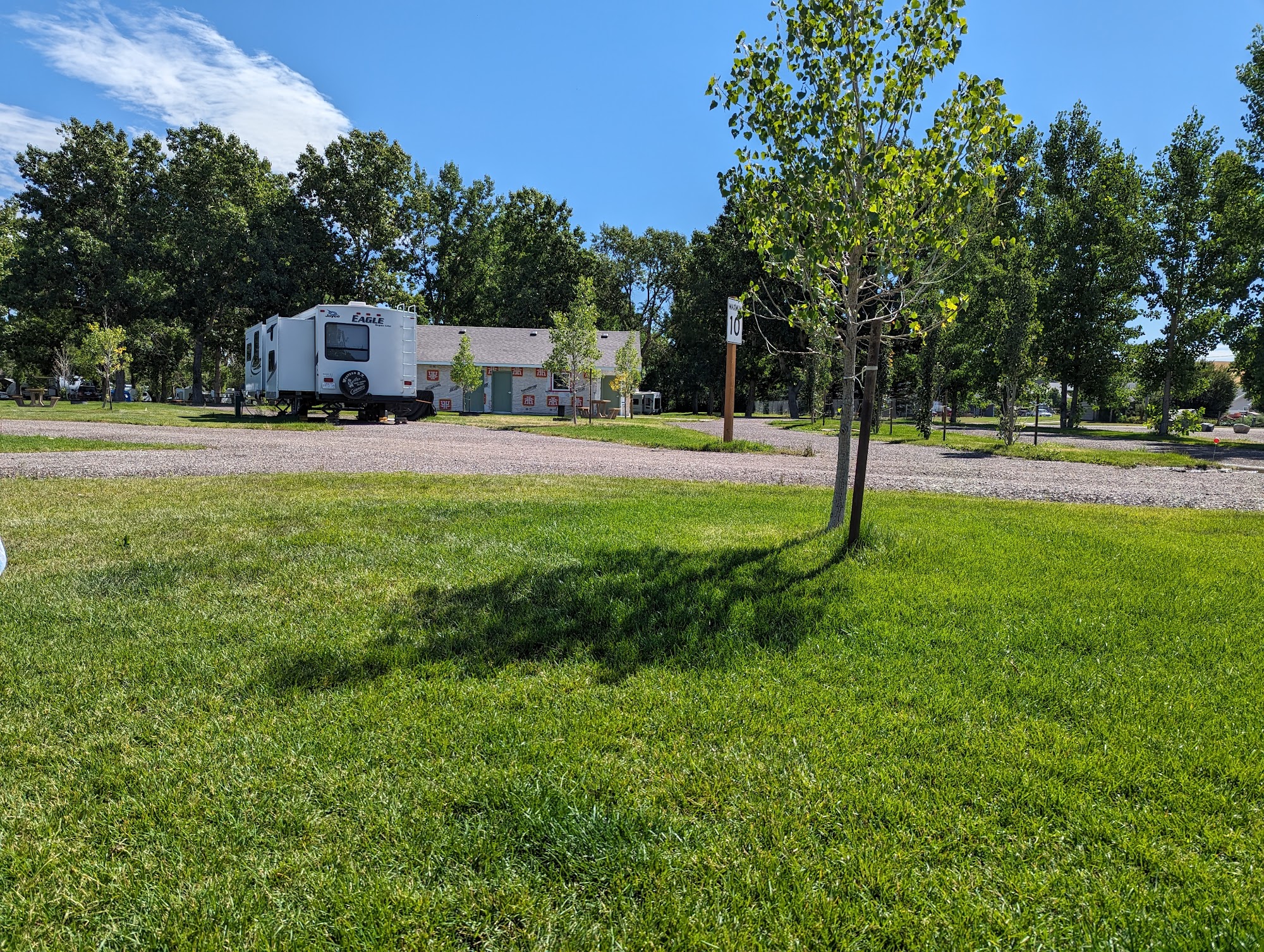 Good clean site. Washrooms are clean, but you have to hold down the shower button every 10 seconds for water. Splash pad and playground near the site, which my kids enjoyed. Town is close by if you need anything.