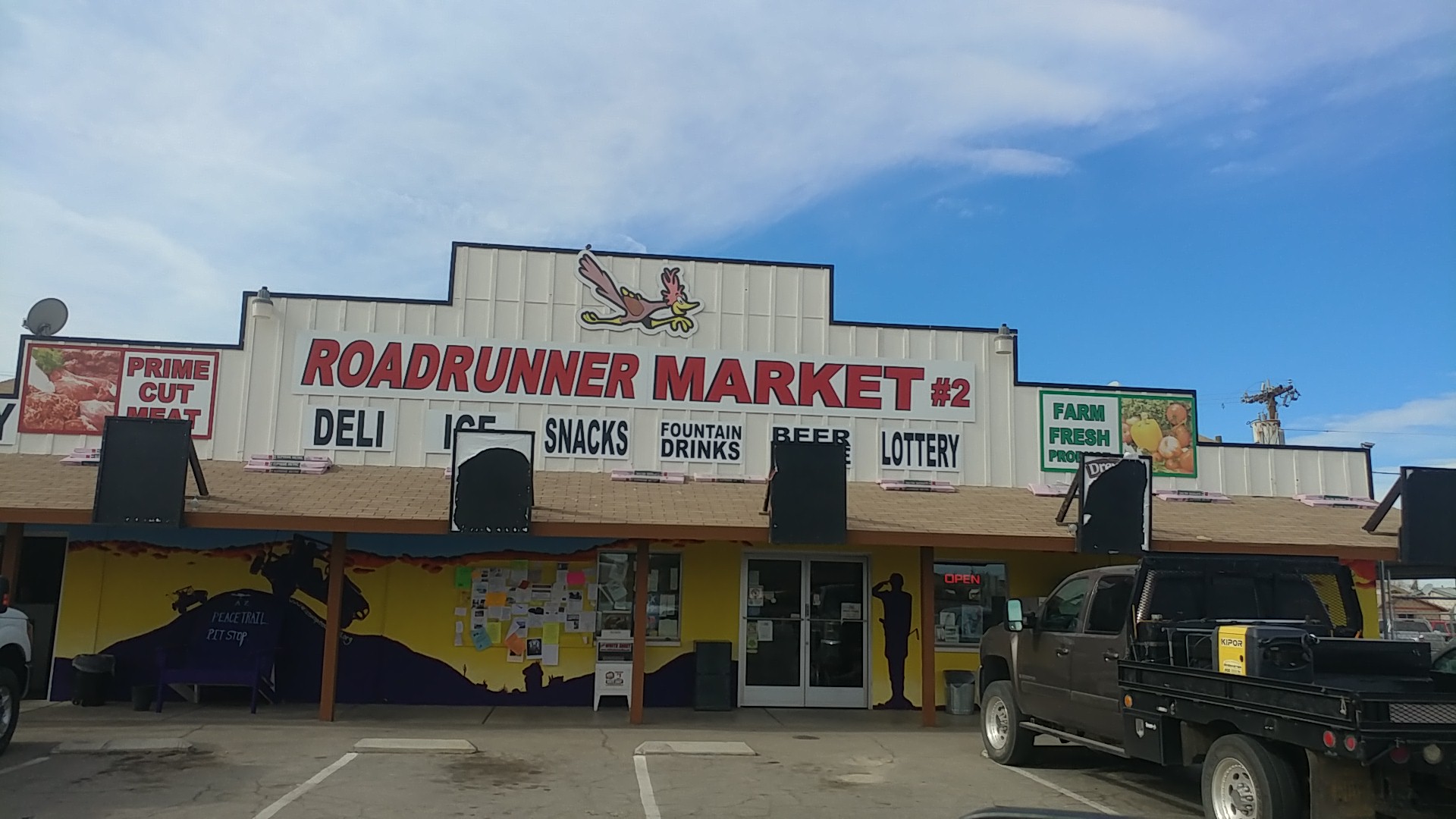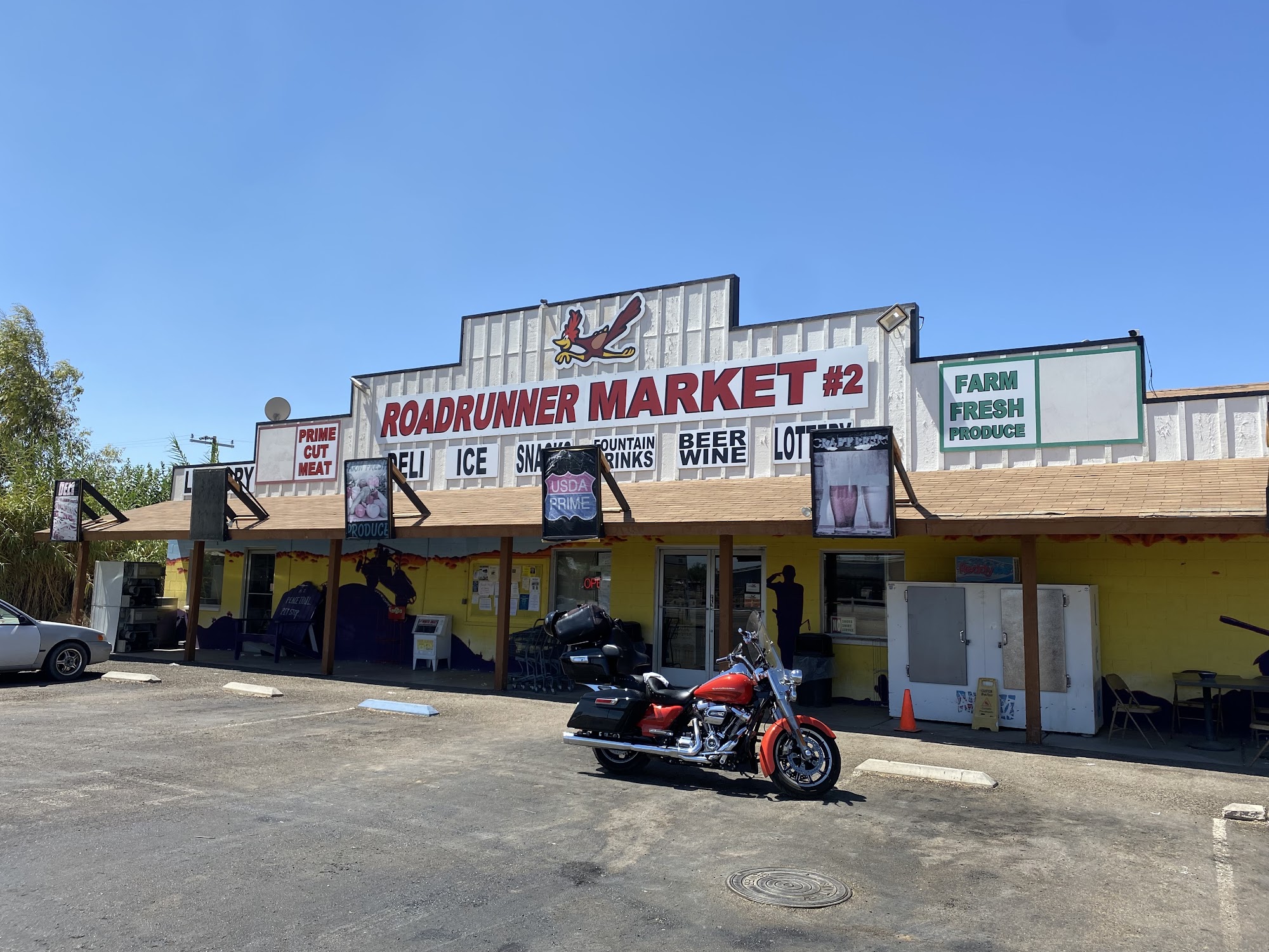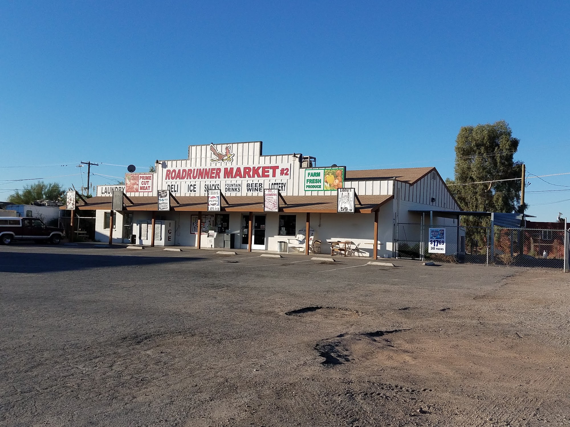 ROADRUNNER MARKET #2 is a small, quaint grocery store located in the tiny town of Bouse. Despite its modest size, the market offers a decent variety of fresh produce, including melons, vegetables, tomatoes, salads, onions, potatoes, and even avocados. Customers can also find a selection of meats like chicken breasts, steaks, and pork loin, as well as freshly made sandwiches, potato salad, tamales, chicken nuggets, lasagna, and hot pizza for lunch. The store is known for its friendly employees and a spotless environment. While the selection may be limited due to the high number of visitors during the cold winter months, the market is praised for its quality products. The produce is delivered fresh on Saturdays, and the homemade meatloaf is a customer favorite. Although the prices may be slightly higher than in larger cities, the owners are said to put a lot of work into stocking the store, and the prices are considered fair for the location. The market's cranberry-orange muffins and banana-nut muffins are also highly recommended.