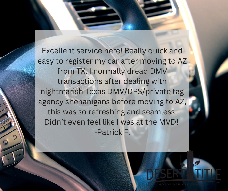 Desert Title is an authorized third party provider for Arizona Department of Transportation. Offering Driver's License and Travel ID services, motor vehicle title and registration, off road registration, Mobile home title services, Level 1 vehicle and mobile home inspections. We specialize in commercial and business services with over 20 years managing large fleet renewals and registration and over 25 years of assisting dealers with title and registration needs. A one stop shop for all your motor vehicle needs and notary services. Due to a high volume of traffic, due to the Travel ID deadline, appointments are required to reduce wait times. Same day appointments may be available. Please contact the office to schedule a time.
