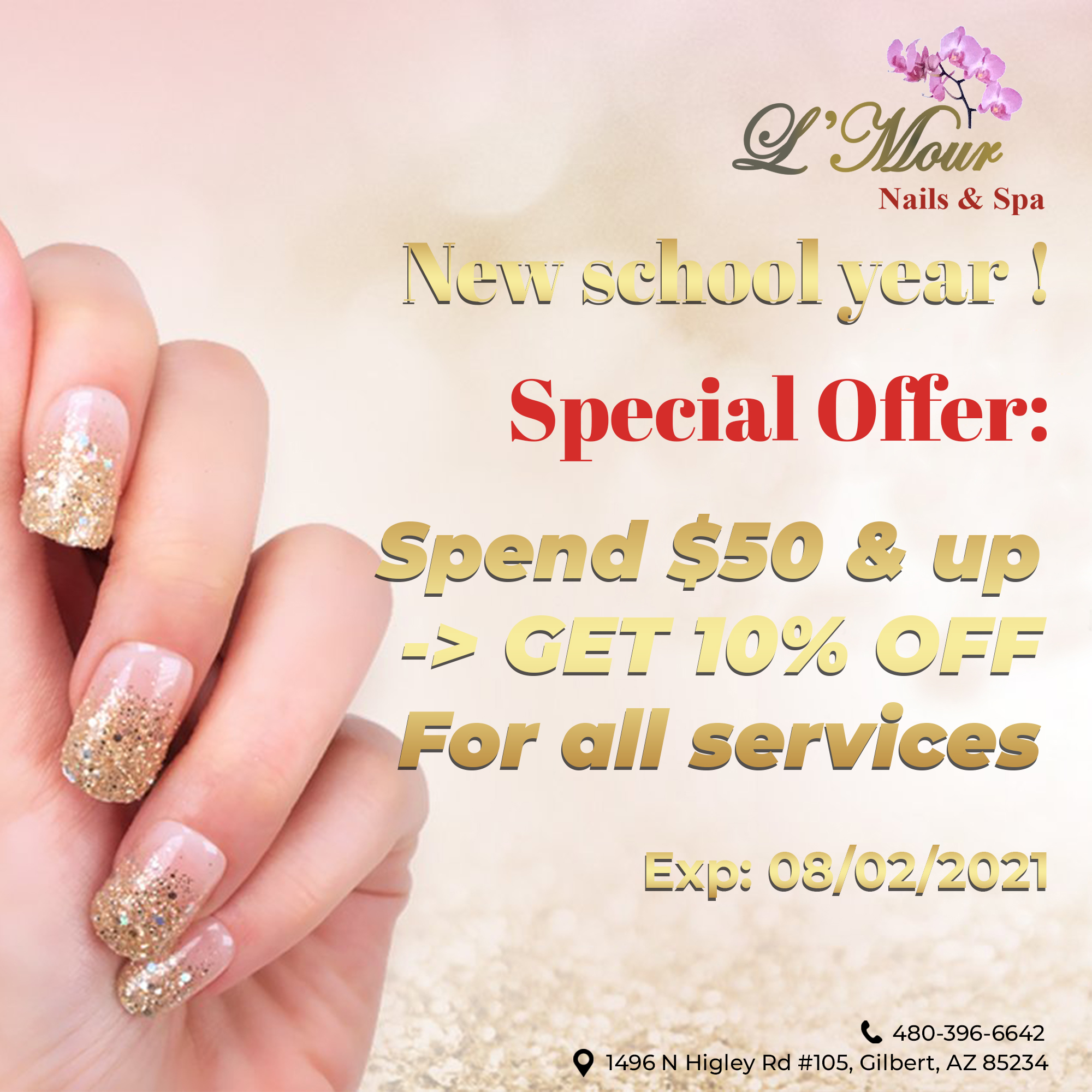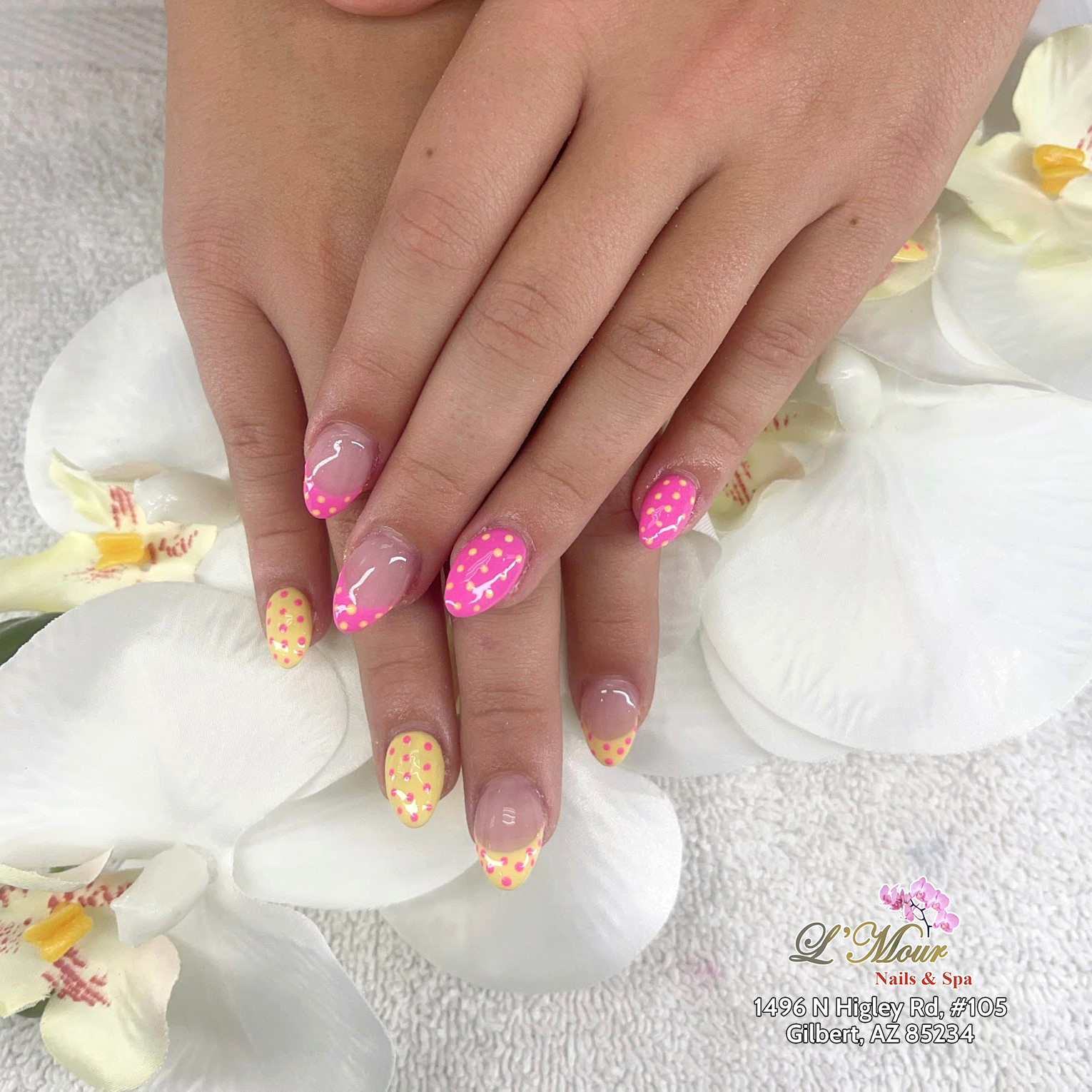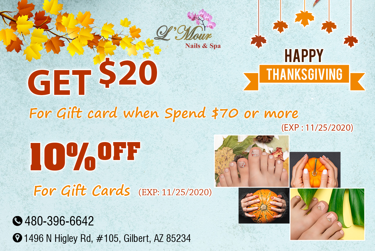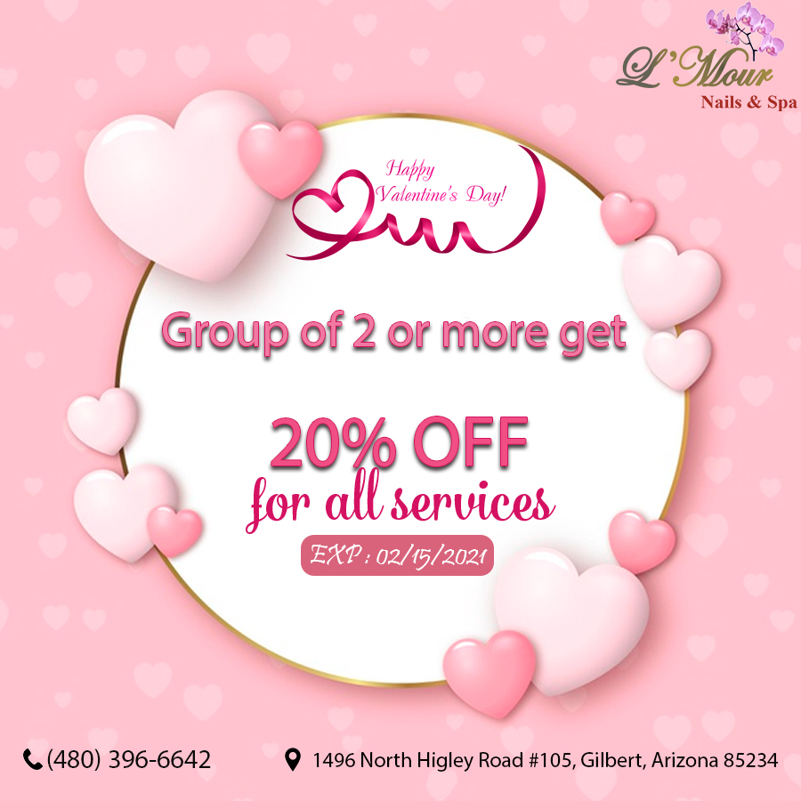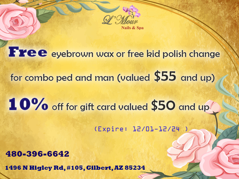 L’Mour Nails and Spa is a fun, vibrant nail salon located in Gilbert, AZ 85234. Whether you need a repair or a whole new style, our technicians will give you a look that not only makes you feel great about your nails but also will get the attention of others. All of our clients whether new or regular get the same, attention to detail service that we have come to be known for. Our nail salon offers the highest quality, most enjoyable manicure and pedicure services in Gilbert, AZ. Since our doors opened, we strive to provide each and every client with the most enjoyable and relaxing manicure and pedicure services available.