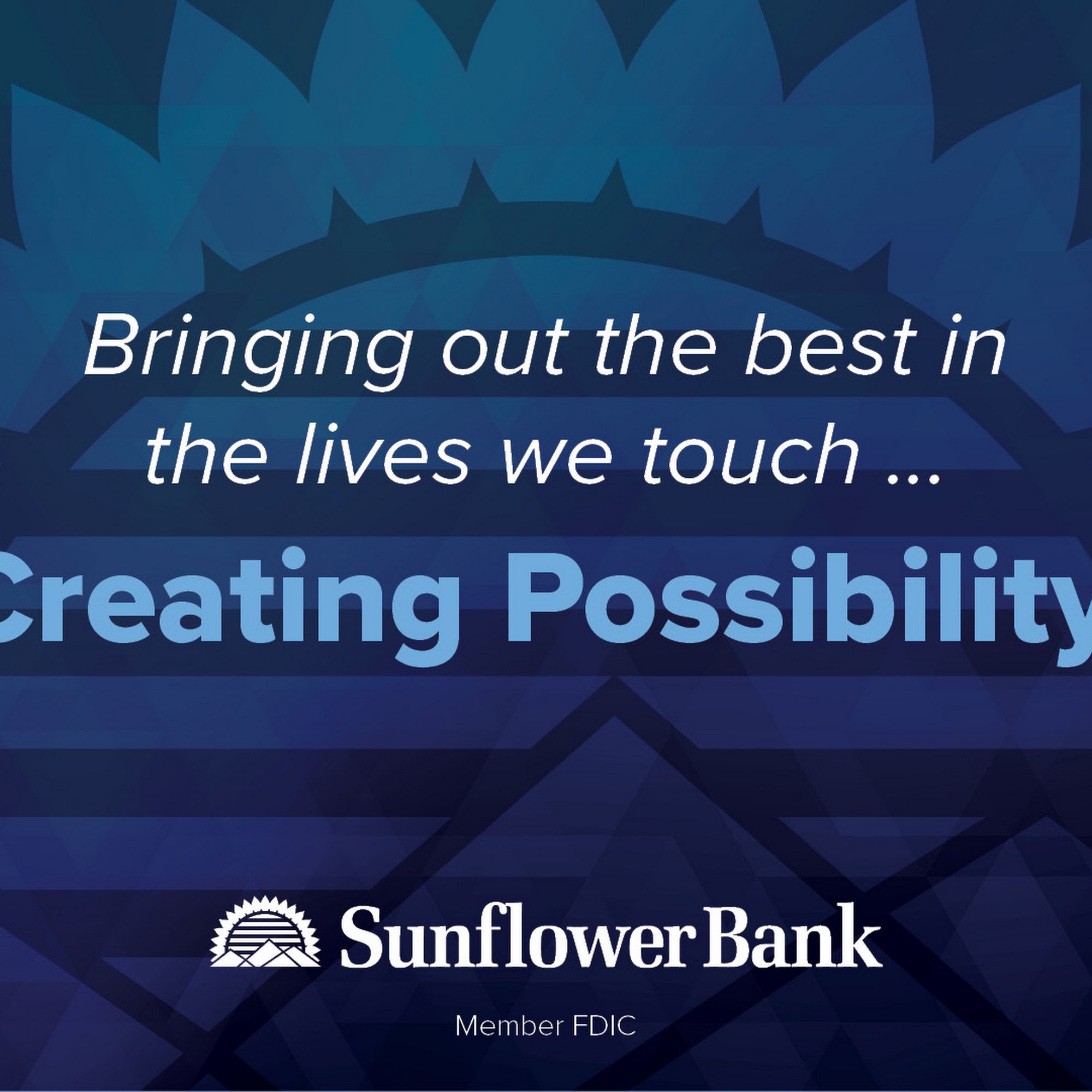 Sunflower Bank is a community bank that offers a wide range of personal banking, small business and commercial services, wealth management services, credit cards, home mortgage loans, and more. Sunflower Bank strives to elevate the community banking experience by offering all the tools, technology, products and features you need -- along with the personal attention you deserve. Each year, our bank and employees give back to the community by donating funds and time to local charities and schools. Stop by and see how Sunflower Bank can help Create Possibility for you!