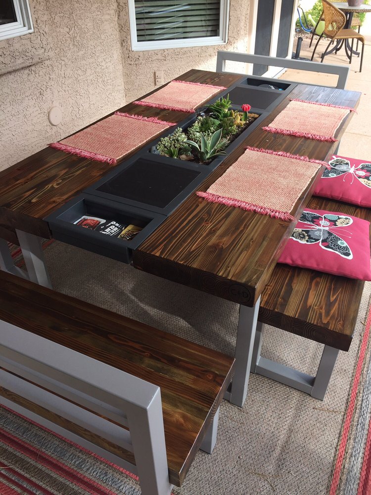 We create durable wood and metal furniture for use inside or outdoors and for residential or commercial applications/use. We specialize in our PATENTED modular table system which includes a cooler for ice and drinks as well as your choice of interchangeable inserts including a garden basket, a fire feature and ‘leaves’ that cover the cooler basin when more table surface is desired. Choose from our large selection of products and colors to create your one-of-a-kind piece of handmade, functional art.