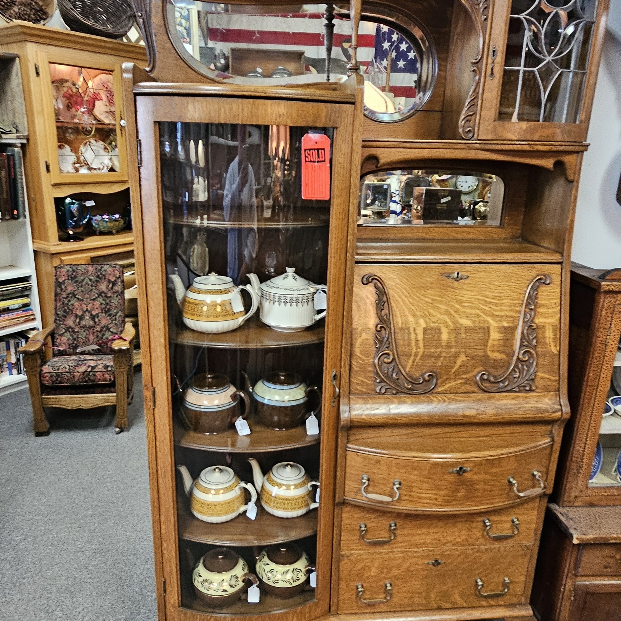 My husband and I stopped in to browse. Wow, she has so many beautiful pieces, pottery pieces, secretary that was gorgeous and this very unusual piece that we would have bought but didn't have room in our truck for. Glad we stopped in.
