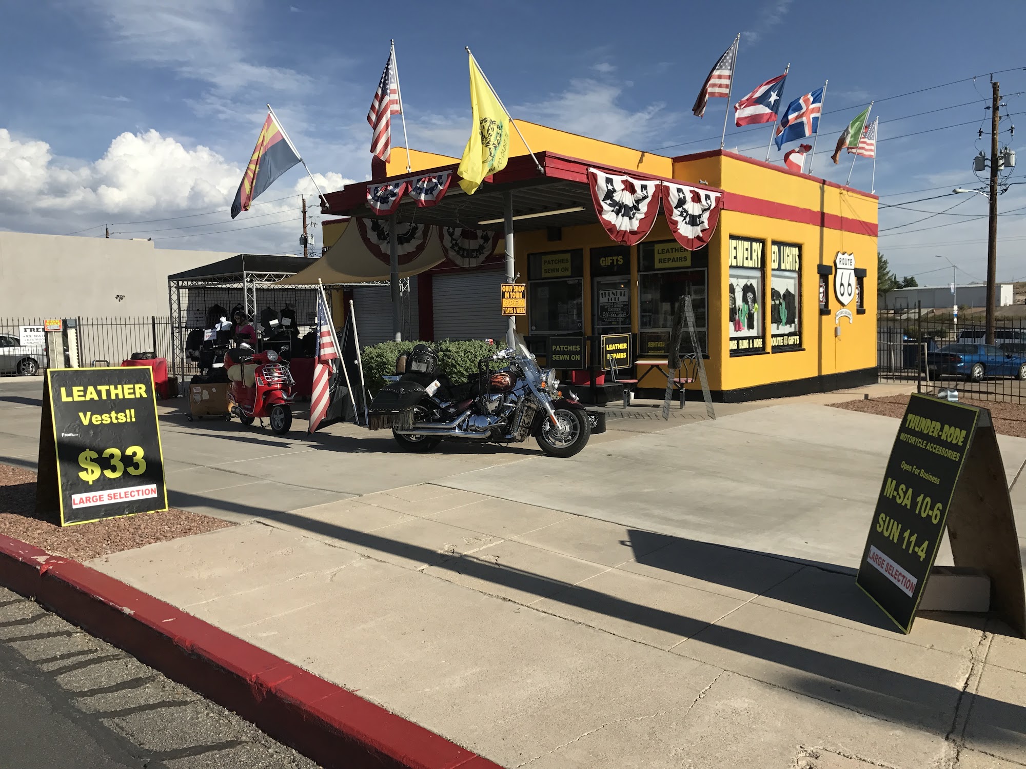 Thunder-Rode Motorcycle Accessories, located along Route 66 in Kingman, AZ, offers a wide range of motorcycle products and services. Customers praise the shop for its great customer service, with staff going out of their way to help, including quick repairs and personalized assistance. They carry a variety of items, and staff like Jack even customizes and hand-sews products. The shop is known for fast shipping and high-quality merchandise, with shirts exceeding expectations. Customers appreciate their dedication to helping riders and their strong sense of community, often recommending Thunder-Rode for Harley parts, service, and custom orders. It’s a friendly place where riders find what they need and feel valued.