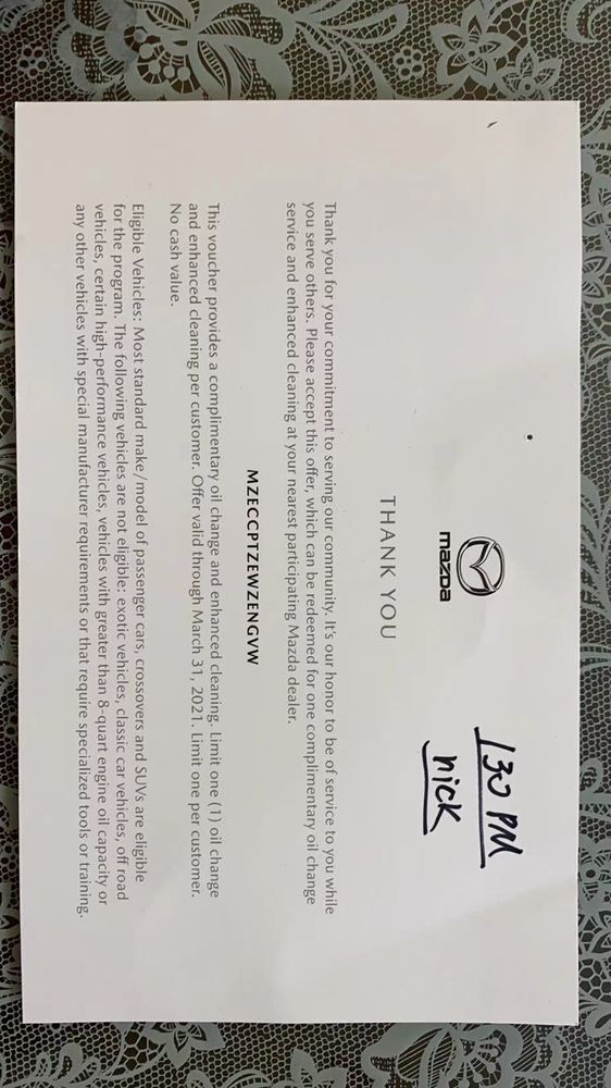 What an amazing costumer experience! From start to finish, I was taken care of. Very efficient service, this will be my new go-to place with my lil Mazda3. Thank you so much, great job! Highly recommended!