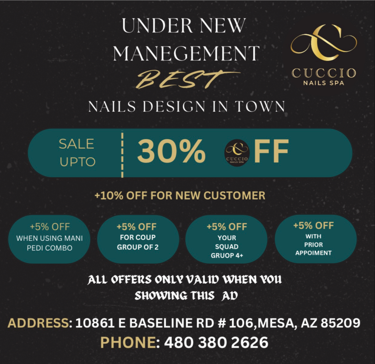 ✨ CUCCIO Nails Salon Mesa AZ Luxury High-End ✨ Under new ownership for just 7 months, we’ve grown from 3.9⭐ to 4.7⭐, proudly serving over 2,000 happy clients. Our expert team has 10+ years of experience, with a young, fast, and talented staff. We specialize in: Nail Art, Long Nail Design, Builder Gel, Dipping Powder, Gel-X, Manicure, Pedicure,— from simple elegance to bold creativity. We bring your nail vision to life with skill, care, and precision. ✨ Don’t just take our word for it — come try it yourself and see why so many fall in love with CUCCIO. You deserve nails this good.