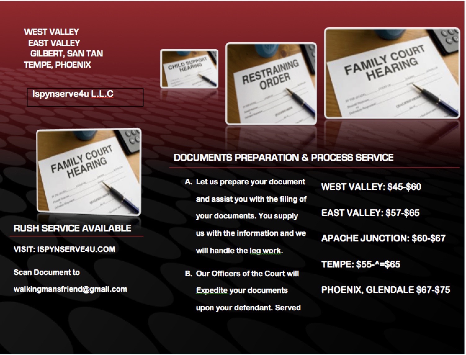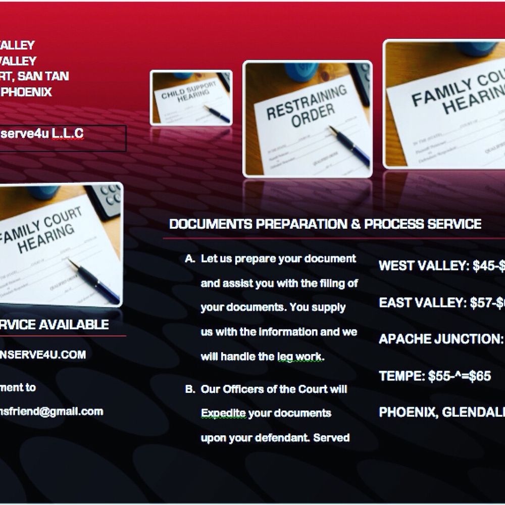ISPYNSERVE4U Process Service / Mobile Notary is a highly regarded business established in 2012, specializing in process service and mobile notary services. With over 11 years of experience, they serve all parts of the valley and have earned a reputation as a 5-star company across platforms like Google, Thumbtack, Yelp, and Bing. Customers consistently praise ISPYNSERVE4U for their professionalism, efficiency, and reliability. They are known for their quick response times and thorough communication, keeping clients updated throughout the process. Many reviews highlight the ease of working with the team, noting their ability to serve multiple documents in a single day and their commitment to meeting client needs promptly. Whether it’s preparing or filing court documents or performing skip tracing, ISPYNSERVE4U aims to exceed expectations and provide stress-free service. Their dedication to quality and customer satisfaction makes them a top choice for anyone in need of dependable process service and notary services.