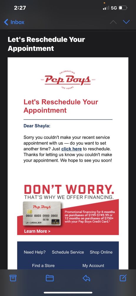 I highly recommend Pepboys who took good care of me. Joe helped me and made things right!