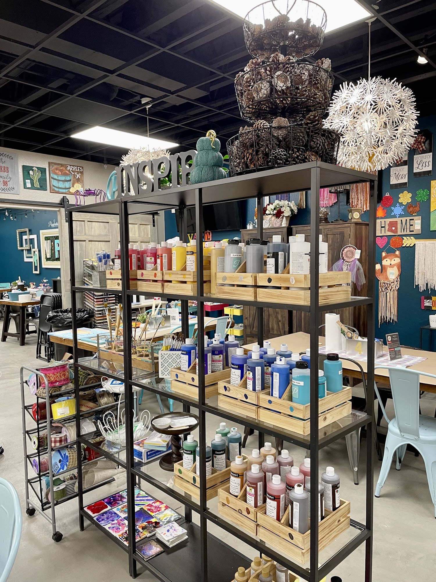 Pinspiration Mesa is a popular craft studio located in Mesa, AZ, and is known as the world's first Pinterest-inspired studio. It offers a wide variety of fun and creative projects for all ages, including painting, wreath-making, string art, candle making, and even a famous Jackson-Pollock-inspired Splatter Room™. Visitors can choose their projects on arrival, and there are no time limits, making it a flexible and enjoyable experience for everyone. The studio is a favorite spot for family activities, corporate team-building events, kids' birthday parties, adult birthdays, bridal showers, bachelorette parties, Girls Nights Out, and holiday celebrations. It features a beautiful private event space, along with drinks and bites to enhance the experience. Staff members like Cyndi, Alexis, and Nick are praised for their helpfulness, guidance, and friendly attitude, making sure guests feel comfortable and supported in their creative pursuits. Many visitors appreciate the opportunity to make different projects and learn new skills while enjoying beverages and socializing. The studio also offers additional options for purchase, such as drinks and food, to complete the experience. The space is well-equipped with helpful amenities like fans to keep cool and Alexa devices for music. Overall, Pinspiration Mesa provides a fun, creative environment perfect for celebrating special occasions or simply enjoying a memorable crafting adventure.