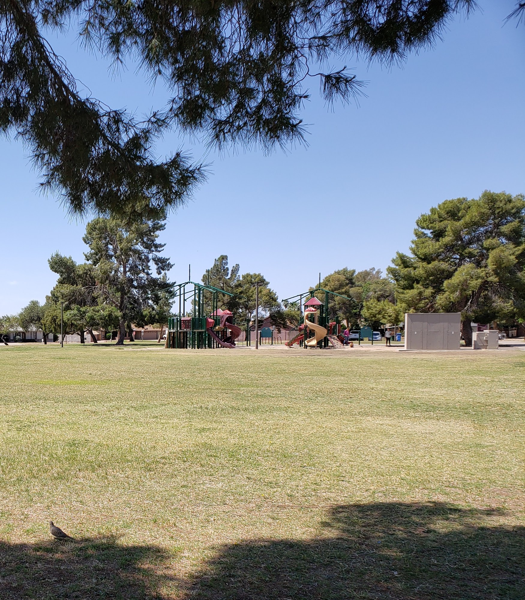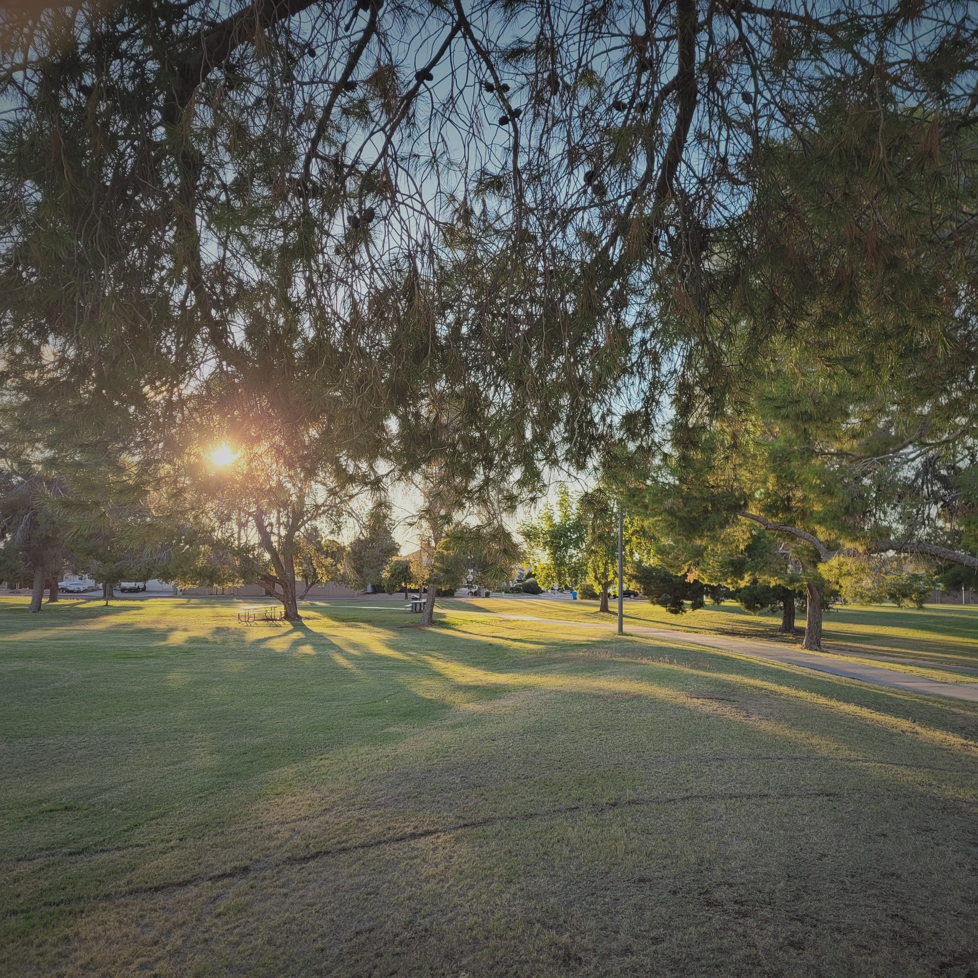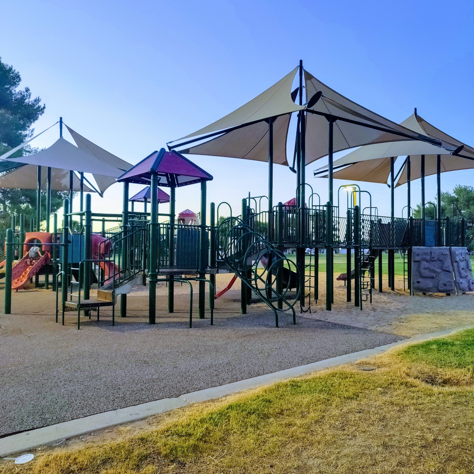 Acoma Park is a clean neighborhood park with a large grassy expanse and plenty of shade from trees and gazebos. It is a fantastic and safe place for families, offering a well-maintained playground great for children under 10. The playground features sand, swings, baby swings, basic climbing equipment, and two covered climbing gyms with a soft foam and sand ground. It is a very nice park with more families than other nearby parks and no homeless hanging out. The park is dog-friendly, with many people bringing their pets. It has picnic areas, though there are only three picnic tables and a need for more benches. A significant drawback is that there are no restrooms and the water fountains do not work. Other noted issues include some graffiti on the play structure and cigarette butts in the sand. Despite this, it is a highly recommended and worthwhile spot for a picnic or a day of outdoor fun.