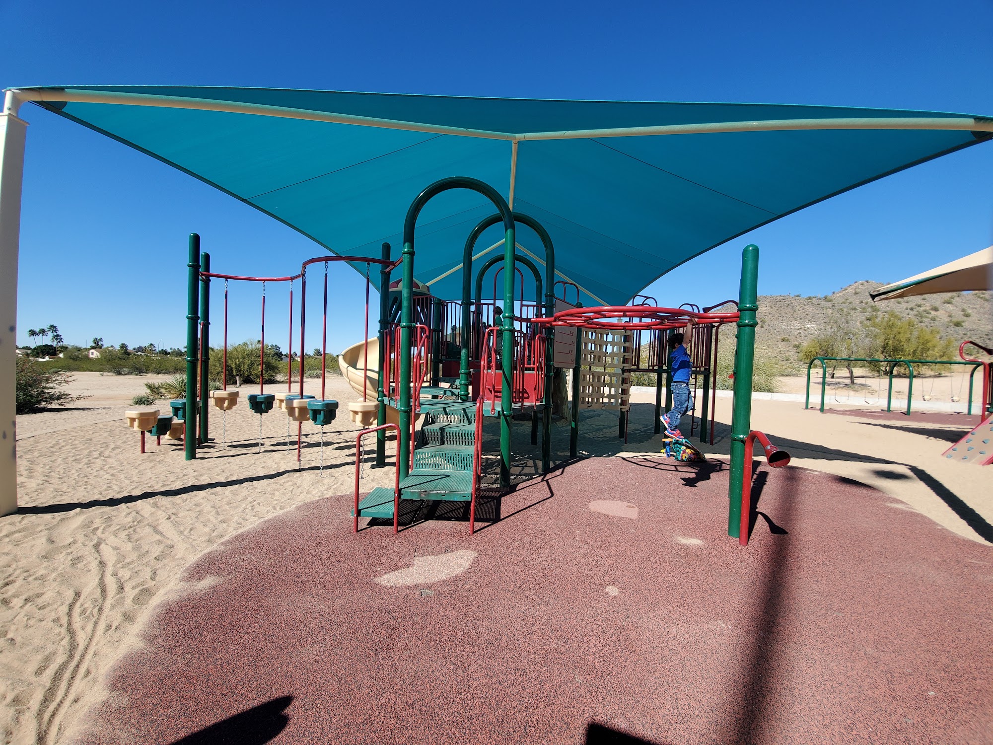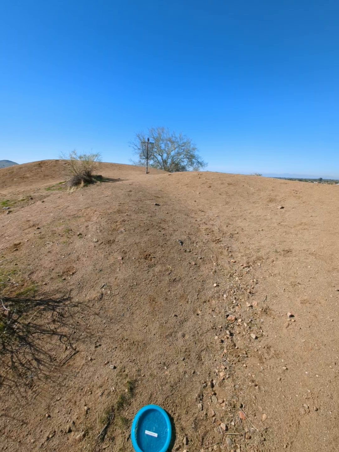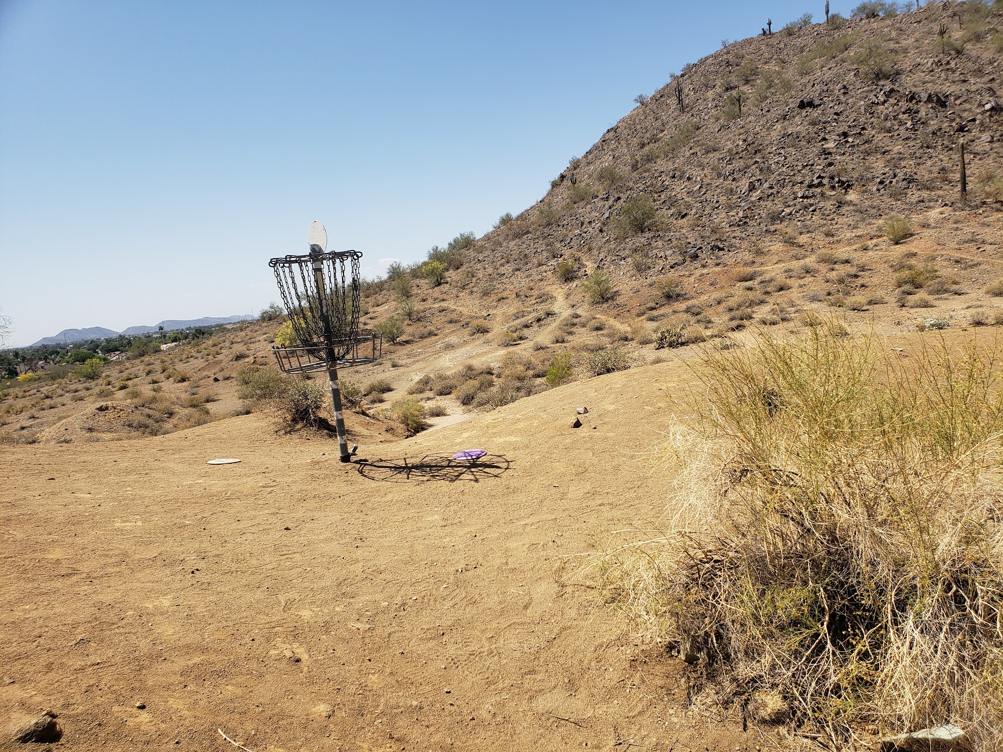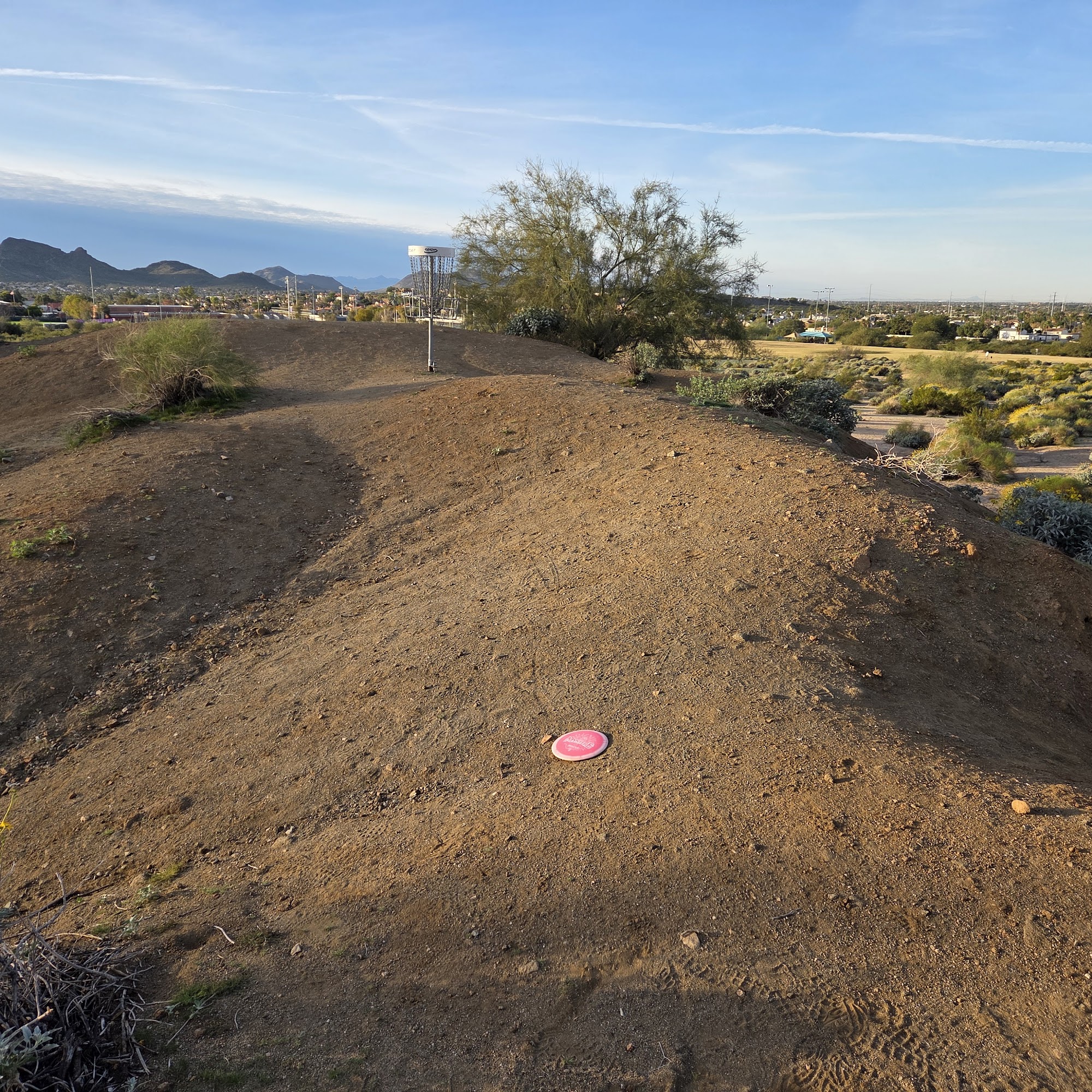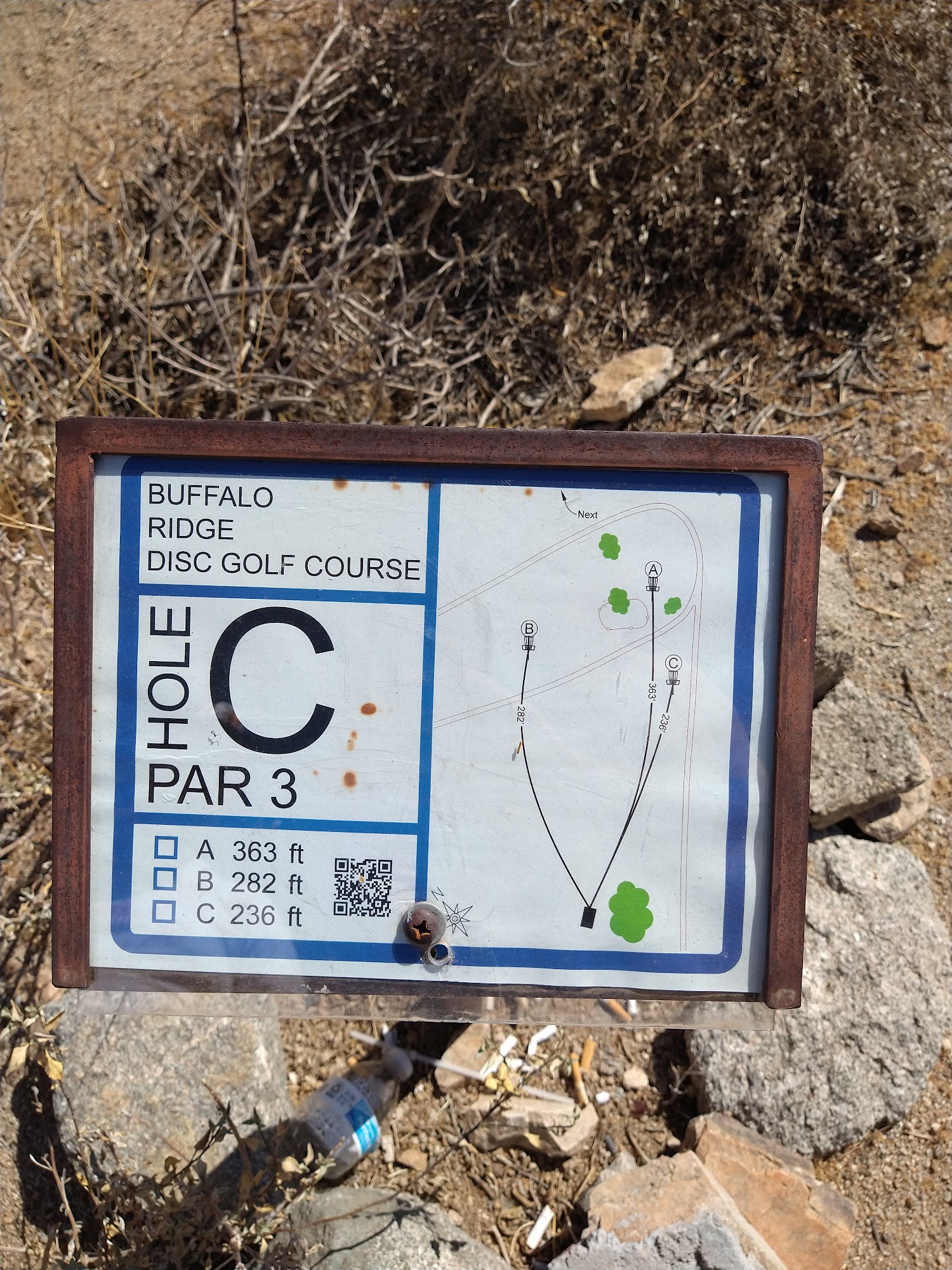 Buffalo Ridge Disc Golf Course is a long, 18-hole course in the desert, offering a three-mile walk with beautiful views. It is a fun and challenging mountain course with up and down the mountainside shots, providing a bit of a workout. The holes have a lot of varieties, with multiple positions up to five different placements to choose from. The terrain is super rough on discs, so players are advised to bring old or crappy discs as they will get severely beaten up. The park also features basketball courts, a baseball field, a playground, and lots of open space, with bathrooms and drinking fountains available. Some find it hard to find the start, as there are no signs in the parking lot. The first hole is next to the playground. Some baskets have new flags to help spot them, and arrows have been added to point to the next tee. It is considered a nice park in general, perfect for a walk whether playing disc golf or not.