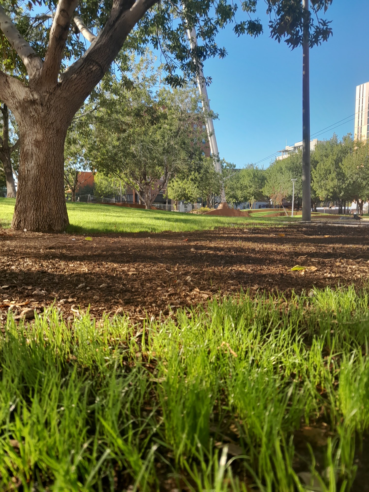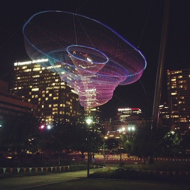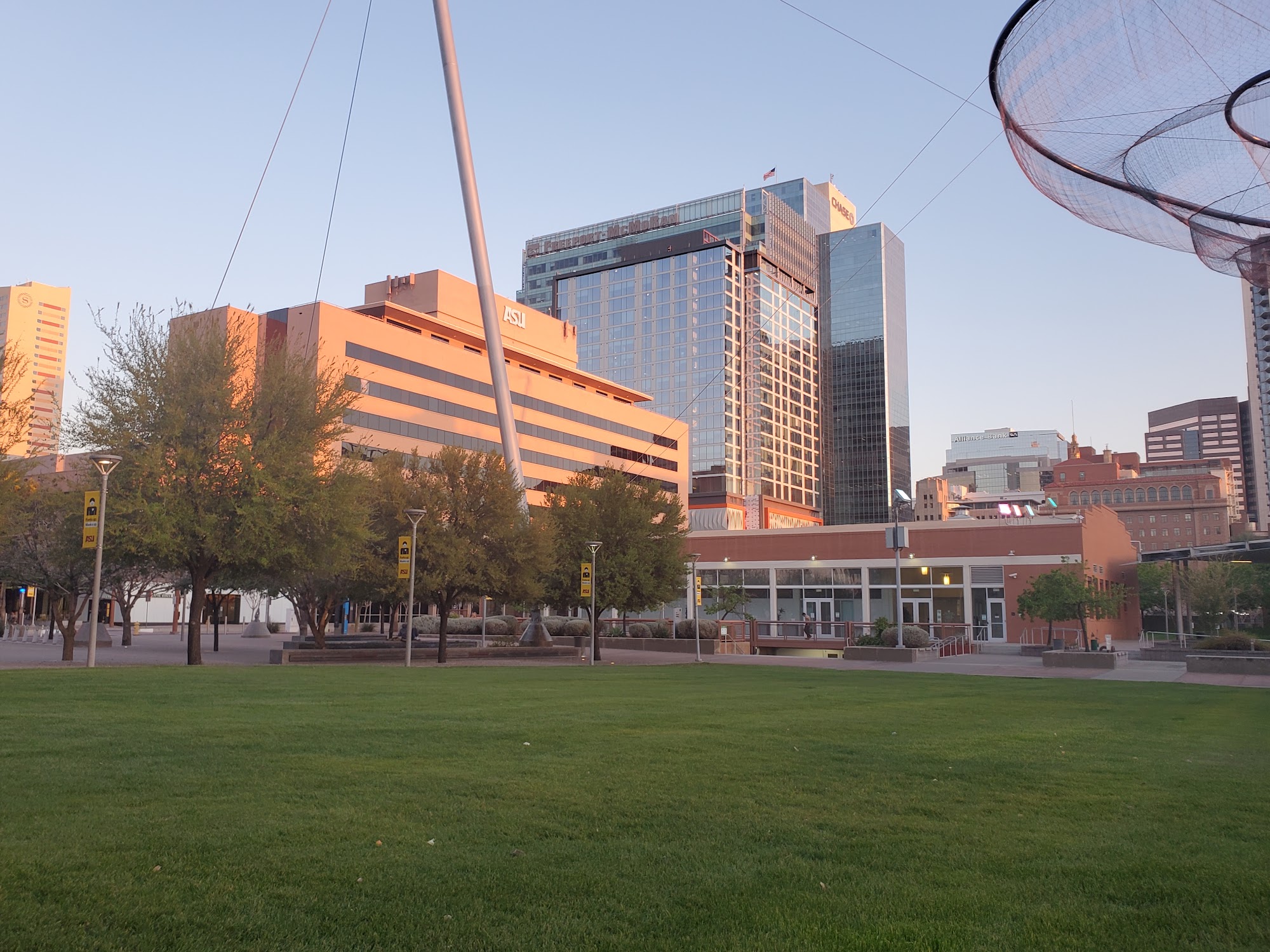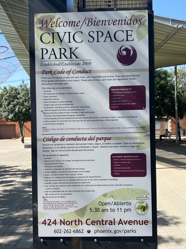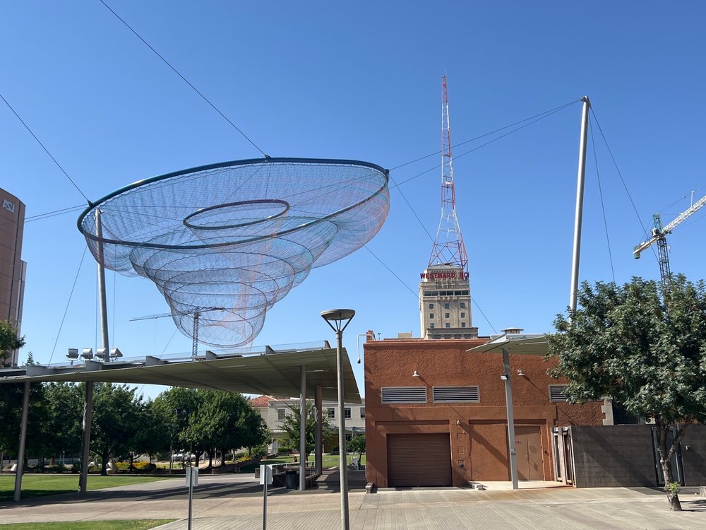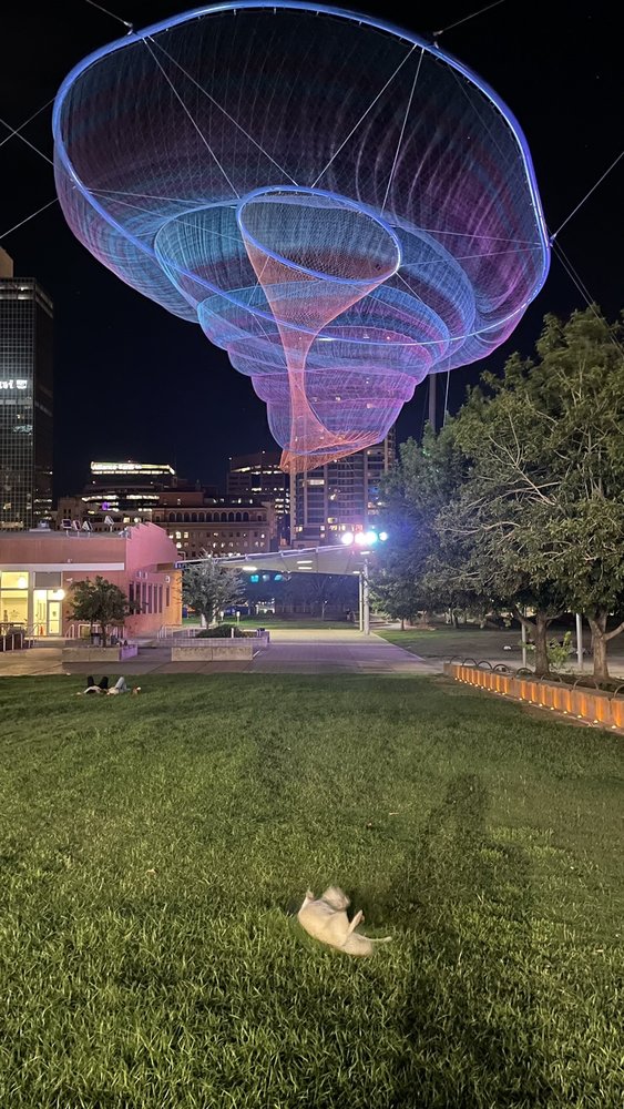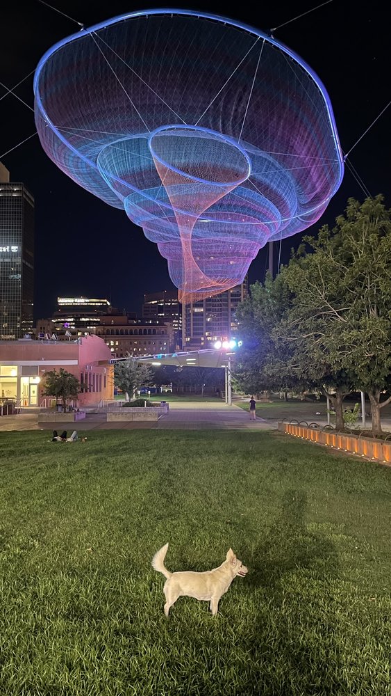 Civic Space Park is a vibrant urban oasis located in downtown Phoenix, offering a blend of nature, art, and community spirit. This park features a band stage, fountains, and unique light installations, making it a fantastic spot for relaxation and enjoyment. With ample open grass areas, it is perfect for families, pets, and anyone looking to unwind under the sun or enjoy a picnic. The park is especially beautiful at night, showcasing a stunning backdrop of illuminated high-rise buildings and the captivating "Her Secret Is Patience" sculpture, which adds an artistic touch to the skyline. Civic Space Park is easily accessible via light rail and bus, though parking can be challenging. It serves as a popular gathering place for residents, students from nearby Arizona State University, and visitors, who often engage in activities like studying, practicing yoga, or attending community events. The park incorporates sustainable design features, such as solar panels and pervious concrete, aligning it with modern environmental values. Whether enjoying a serene stroll, capturing beautiful sunset photos, or attending a performance, Civic Space Park is a must-visit destination for anyone seeking a refreshing escape in the heart of the city.