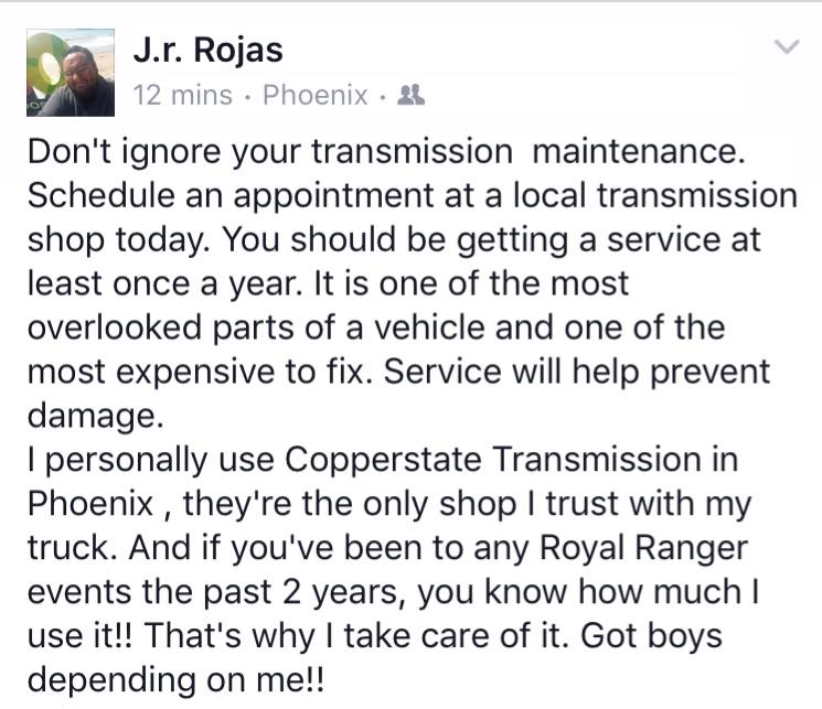 CopperState Transmission family is amazing services. This family owned business is meticulous and honest in its craft. They assisted with extended warranty company, the process less stressful. The company is the best, very honest and super nice people. They installed transmission supplied and saved thousands off dealer. The car runs great in a couple days. People recommend the place and feel grateful for the outstanding job and the amazing services.