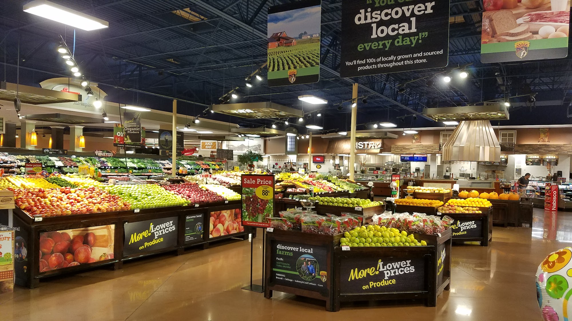 Fry's Marketplace is a very large and expansive store, described as one of the nicer locations in the area. It is noted for being very clean and beautiful, with pretty good stock and friendly staff. The store offers all the usual foods, including beautiful produce, a big Starbucks, a big sushi bar, and a big deli. It also features a bar, along with a little book section, shoes, clothing, and household items. Shoppers find good prices and great digital coupons. However, some reviews note that the "Latin American food" section is lacking and that workers stocking during shopping hours can make customers feel in the way. There are also occasional concerns about items like dog snacks needing better checks for freshness.