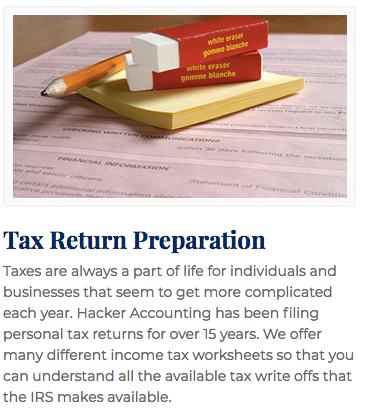 I recently started using Hacker and Accounting for my business taxes, and I'm extremely happy with their services.