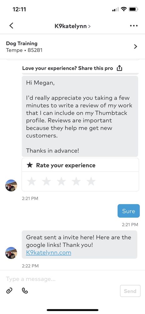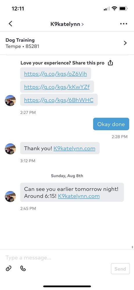 All postive reinforcement...training dogs not only inside but also outside in the real world. We want our clients happy both inside and outside. (over 7,000 clients Valleywide) We make sure the client is satisifed 1st! YouTube over 700 videos and over 80,000 views!! Top ratings with the BBB and Angies list for 11 years! ! We are proud to serve the entire valley! Want more?;) follow us on Pinterest over 23,000 followers! With over 450,000 views monthly! Google plus with over 885,000 views!! Linked in with over 29,500 business associates! Twitter with over 2,100 followers! We have been happily serving the valley for 16 plus years!! Now on instant gram! K9katelynn.com Love helping people and dogs! Like to see how owners change thier views on thier dog and how they feel about them after proper training! Equally interest seeing how the dog responds and builds up confidence!! Proper respect and treating your dog well you will see great improvements and proper love! It's fun and interesting to see the imorovement with proper training! We believe in mental stimulation , exercise, and positive reinforcement! No shock collars , hitting or raising our voices!! Thank you from your friends at K9katelynn.com