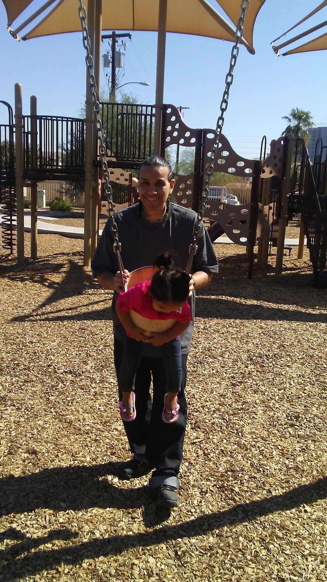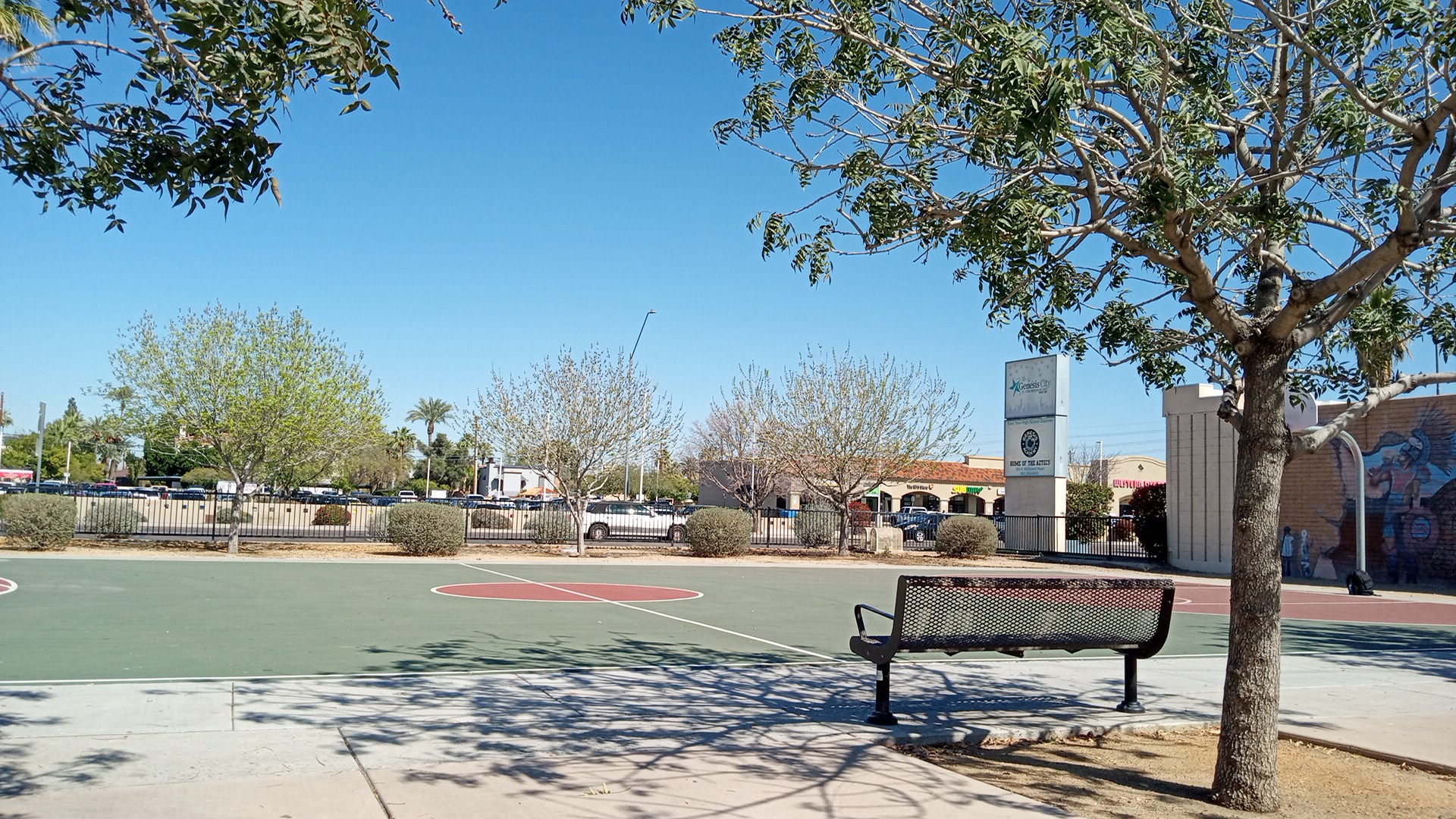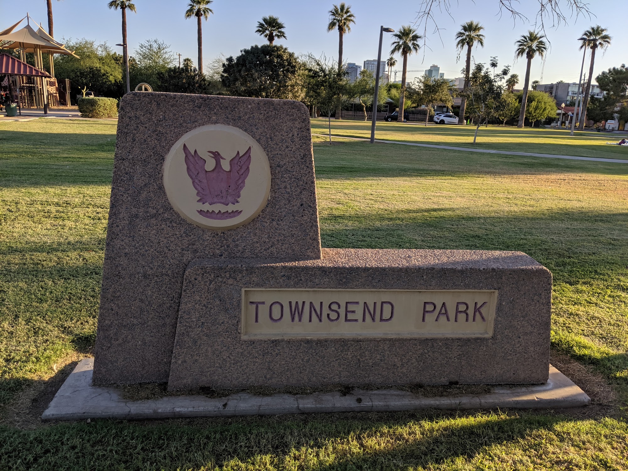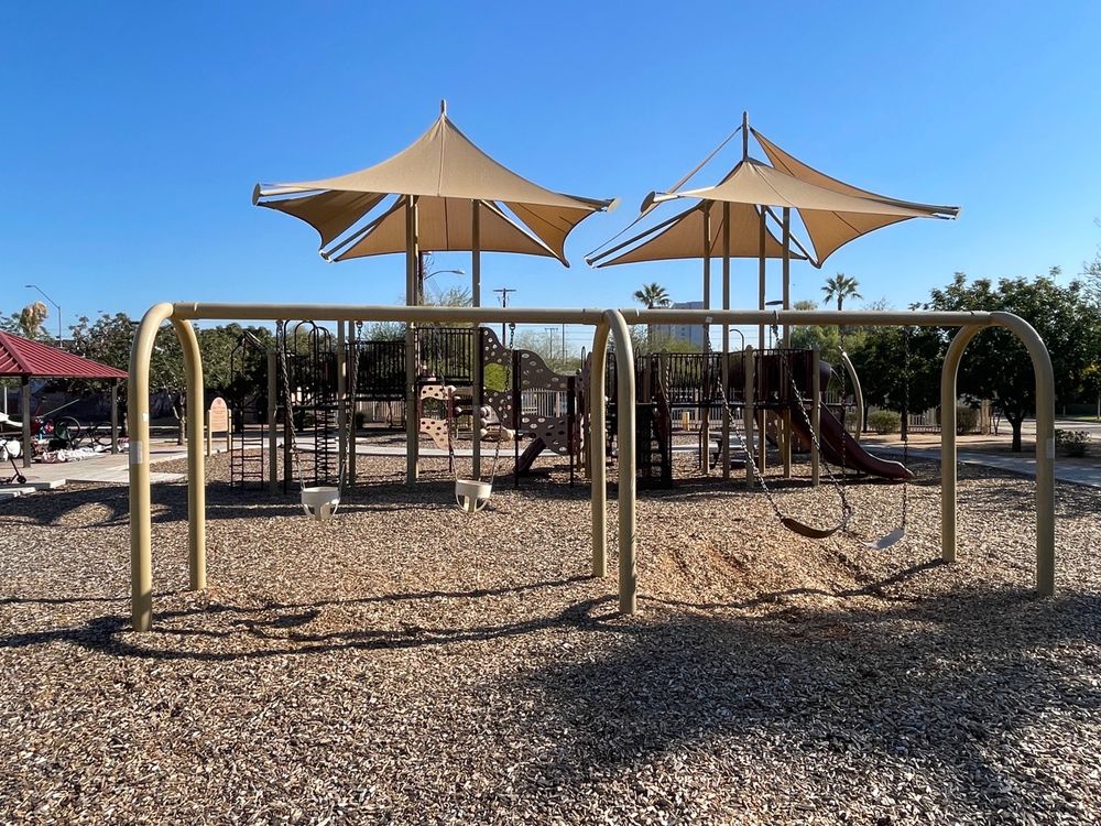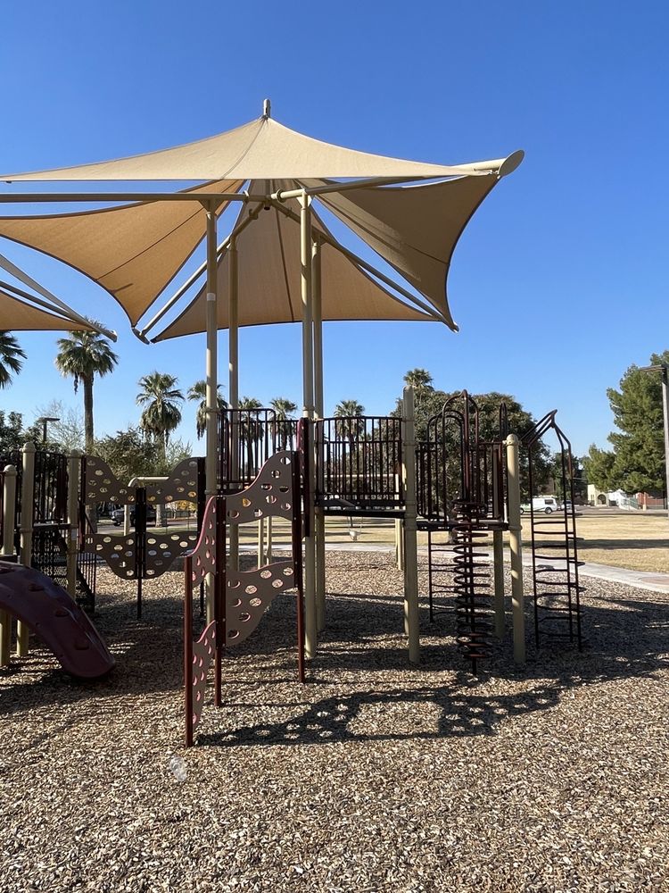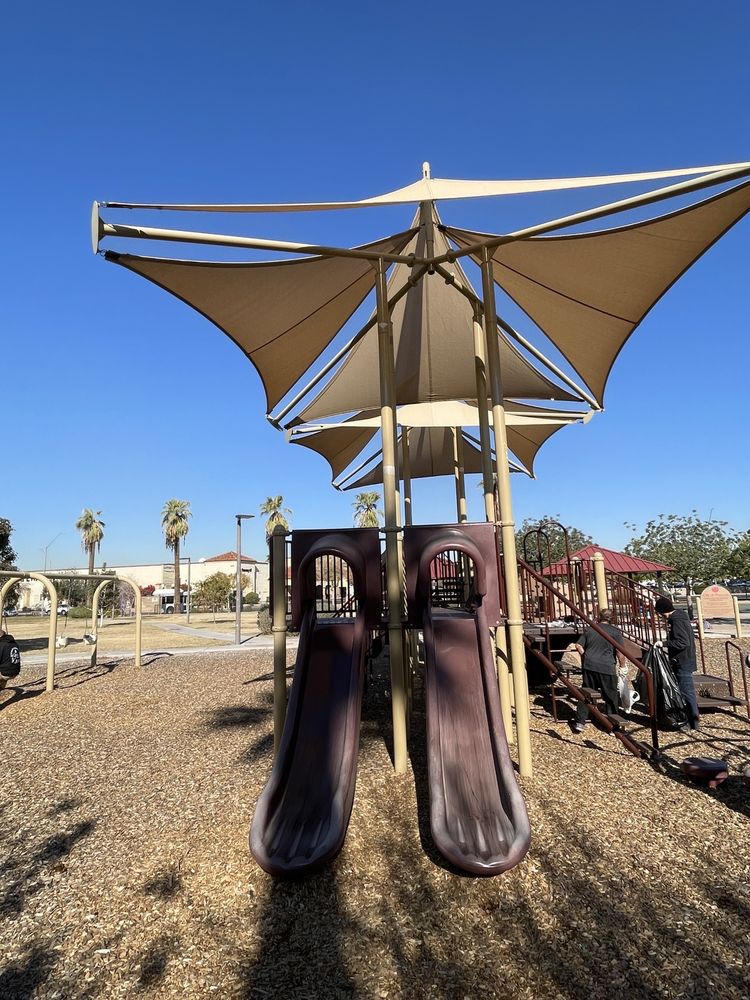 Townsend Park is a small, 1.8-acre park located just south of a shopping complex. It features a lighted basketball court with a mural, two ramadas with picnic tables, and a playground equipped with a jungle gym, slides, and swings, all under a shade structure. The park is well-maintained, with staff seen cleaning during visits, and offers a pleasant environment with beautiful greenery and palm trees. It is an inviting place for family outings, picnics, and outdoor activities like soccer and kite flying. However, Townsend Park has some limitations. There is no restroom facility, and the drinking fountains have issues. The park is open from 6am to 10pm, but visitors should be aware that it lacks electrical outlets and grills. Parking is limited, and while it is a decent park for local residents, it may not be a destination park. Some visitors have noted the presence of a homeless camp under the shelter, which can affect the experience. Despite these drawbacks, it remains a nice spot for a quick visit or to spend time with family, as long as expectations are managed.