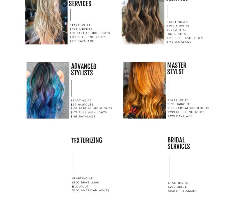 Our team of trained professional stylists offer services from haircuts, styling, updo's and more. We specialize in a variety of hair colors and textures including blondes, brunettes, reds, wavy and so much more! Call us to book your appointment today! We're excited for you to come in!