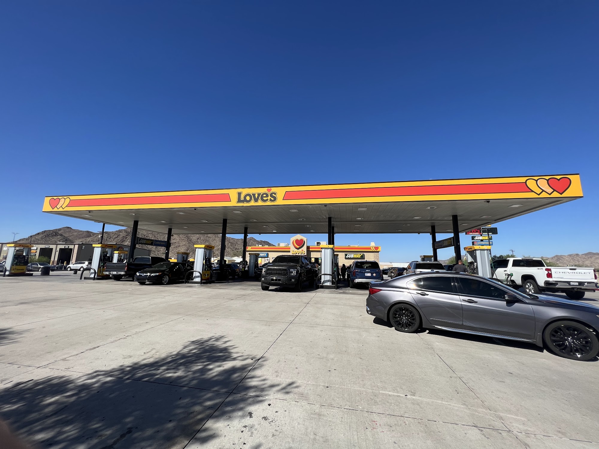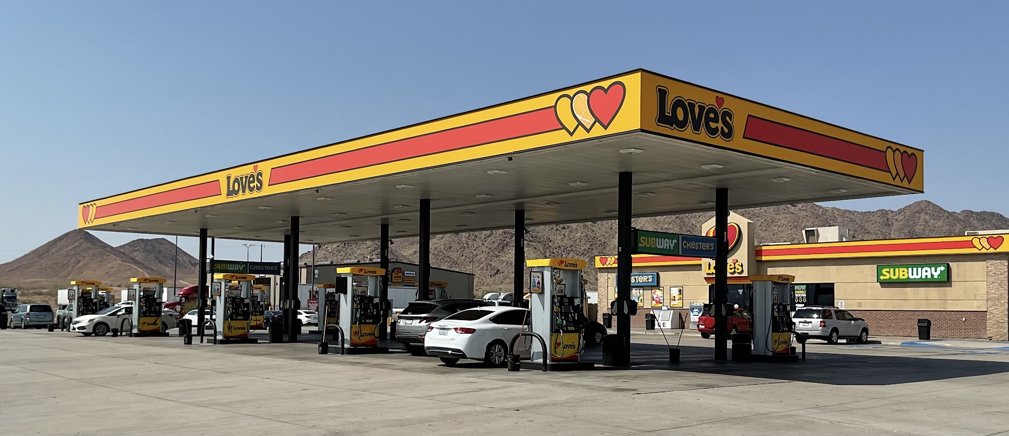 Located conveniently on I-10 at Exit 17, Love's Travel Stop is a busy and decently run travel center. It is passionate about providing friendly service, with staff noted for being great and knowing how to help. The facility offers diesel fuel, gas, EV charging, and a modern store stocked with food and supplies, including good coffee, ice cream, beverages, and awesome pre-made sandwiches and hotdogs. The store layout is a bit tight, especially when full. The location has plenty of truck parking and the fuel island is kept up. The showers and restrooms are generally clean, though they can become a mess due to very heavy traffic and steady crowds, making it hard for staff to keep up. The facility itself is in good shape but has an older, nostalgic look as it has not been renovated. The stop is very popular and often overcrowded with casual travelers and drivers, which can lead to crowded aisles and restrooms and a long wait to get in and out. It may not be the place for impatient people. However, for those who love the Love's experience, it provides a good spot with restaurant choices and a snack shop under one roof, making it a great place to cool off, charge, and refuel.