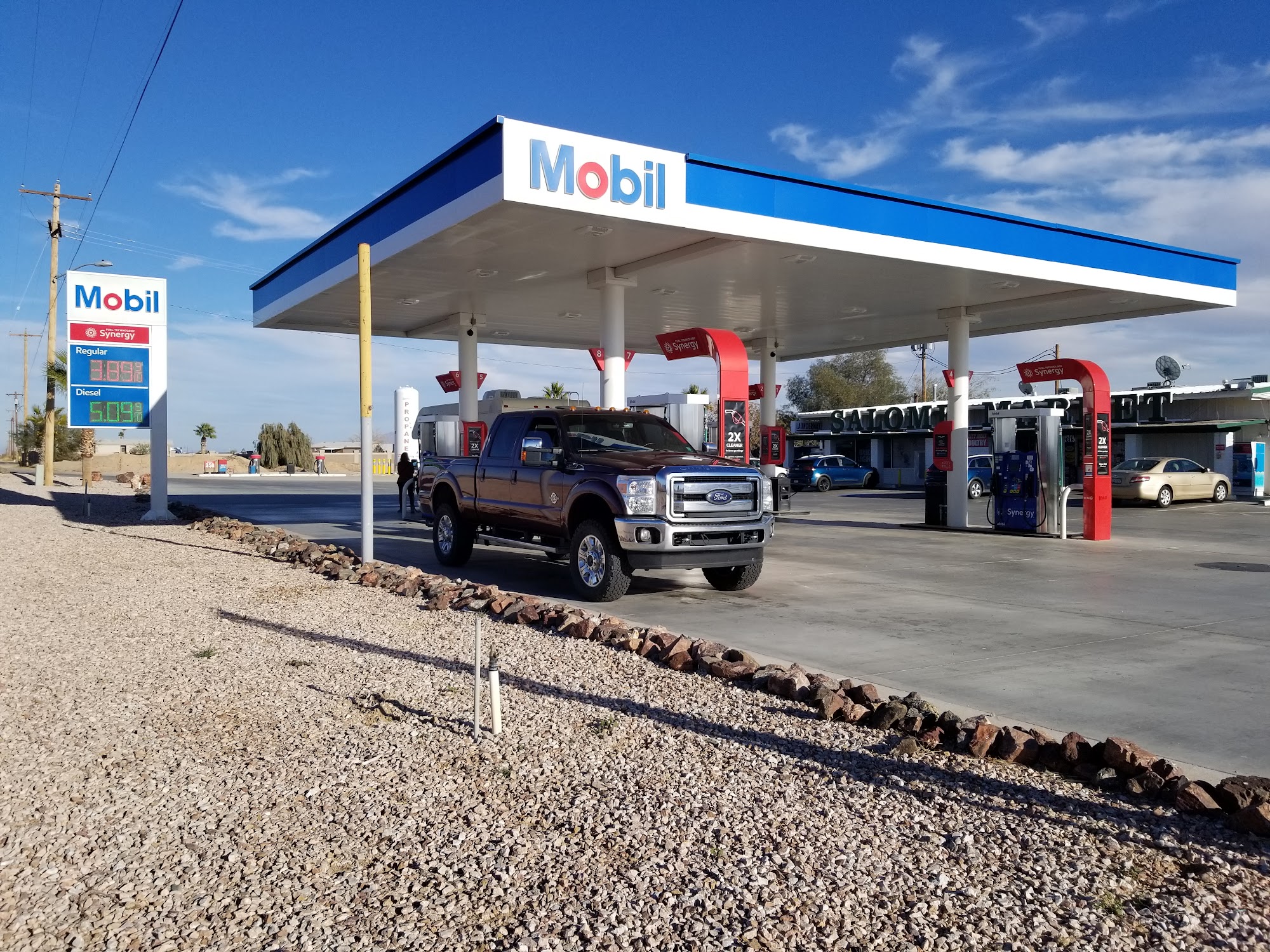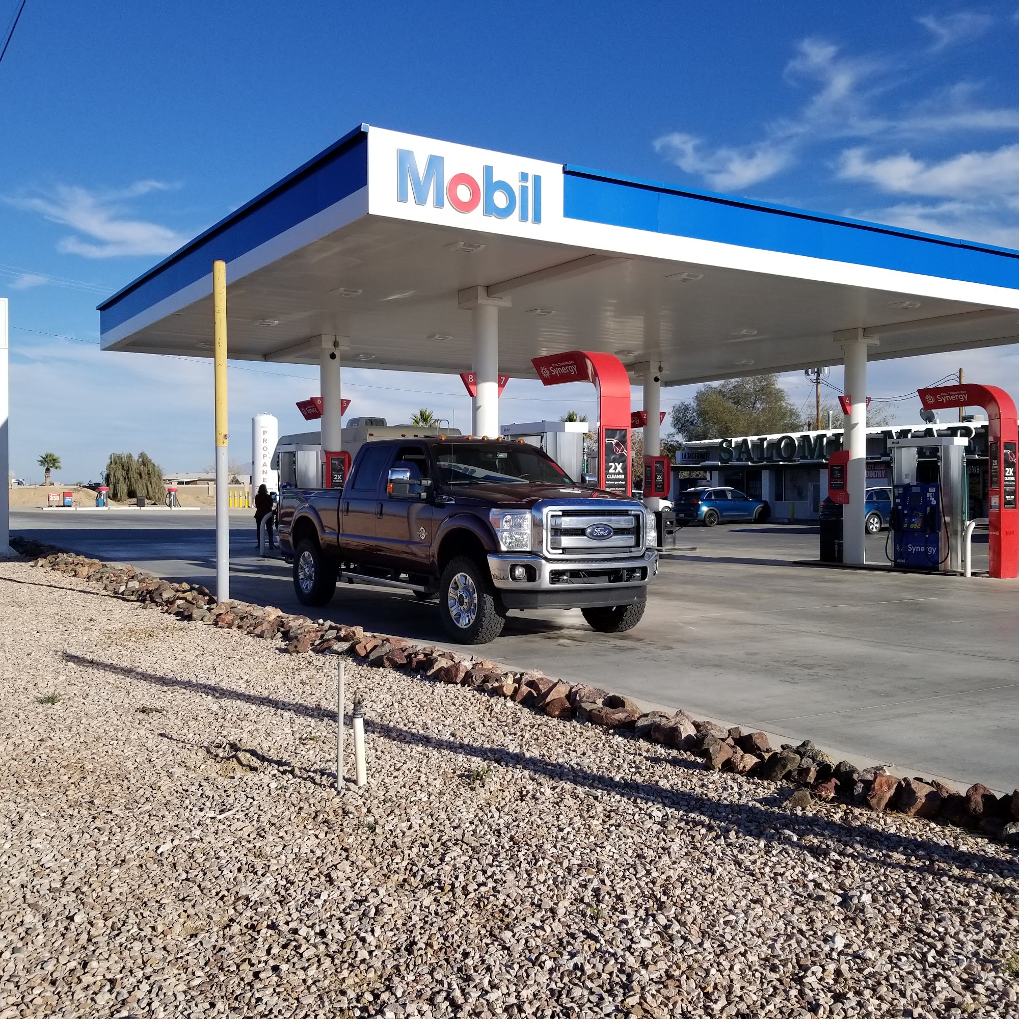 Mobil is a friendly and well-maintained convenience store with multiple gas pumps and good parking. The staff are courteous and create a welcoming, positive vibe, often joking and making customers feel at ease. The store offers snacks, drinks, and a clean restroom, making it a convenient stop for travelers heading to Lake Alamo or eastward. The location is kept neat, with staff members actively working outside, such as trimming trees, detailing fuel pumps, and mowing grass, which helps keep the place looking good. While gas prices are higher than in nearby towns, the overall experience is pleasant, and many customers appreciate the clean environment and friendly service. It’s a reliable spot to gas up and enjoy a quick visit.