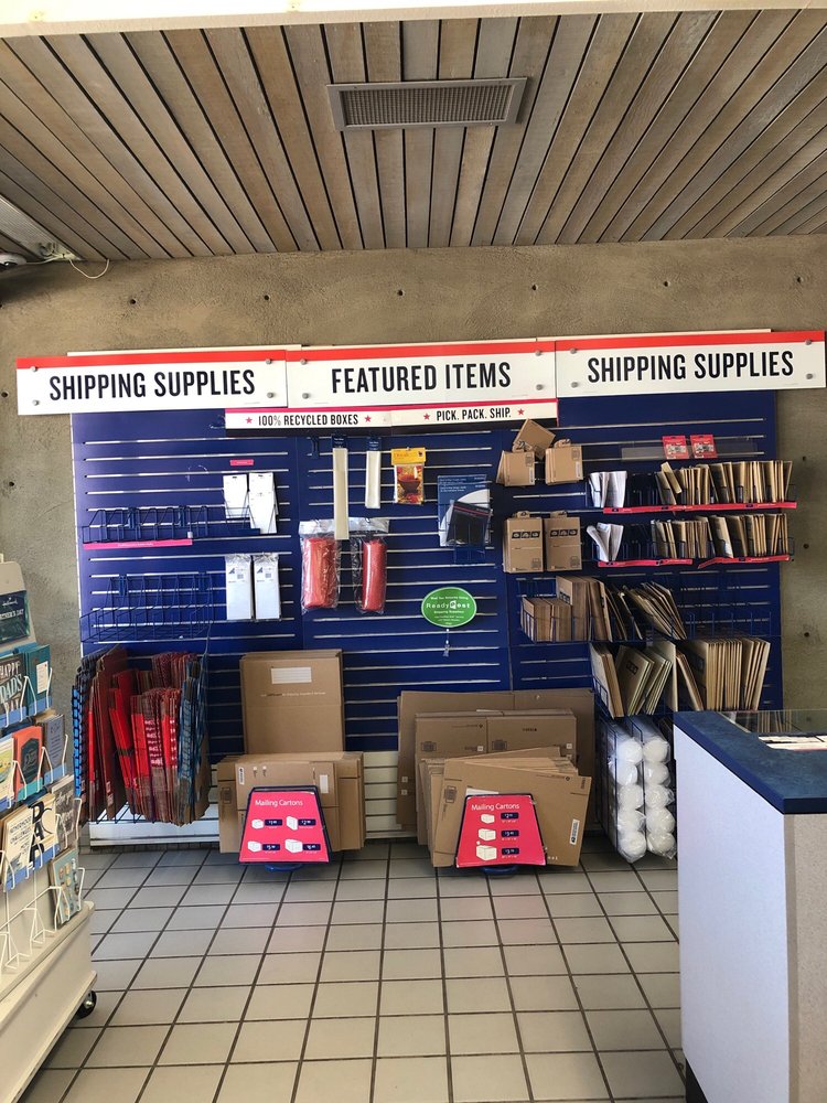 Small post office with service counter, post office boxes to rent, sells some packaging supplies, friendly staff.