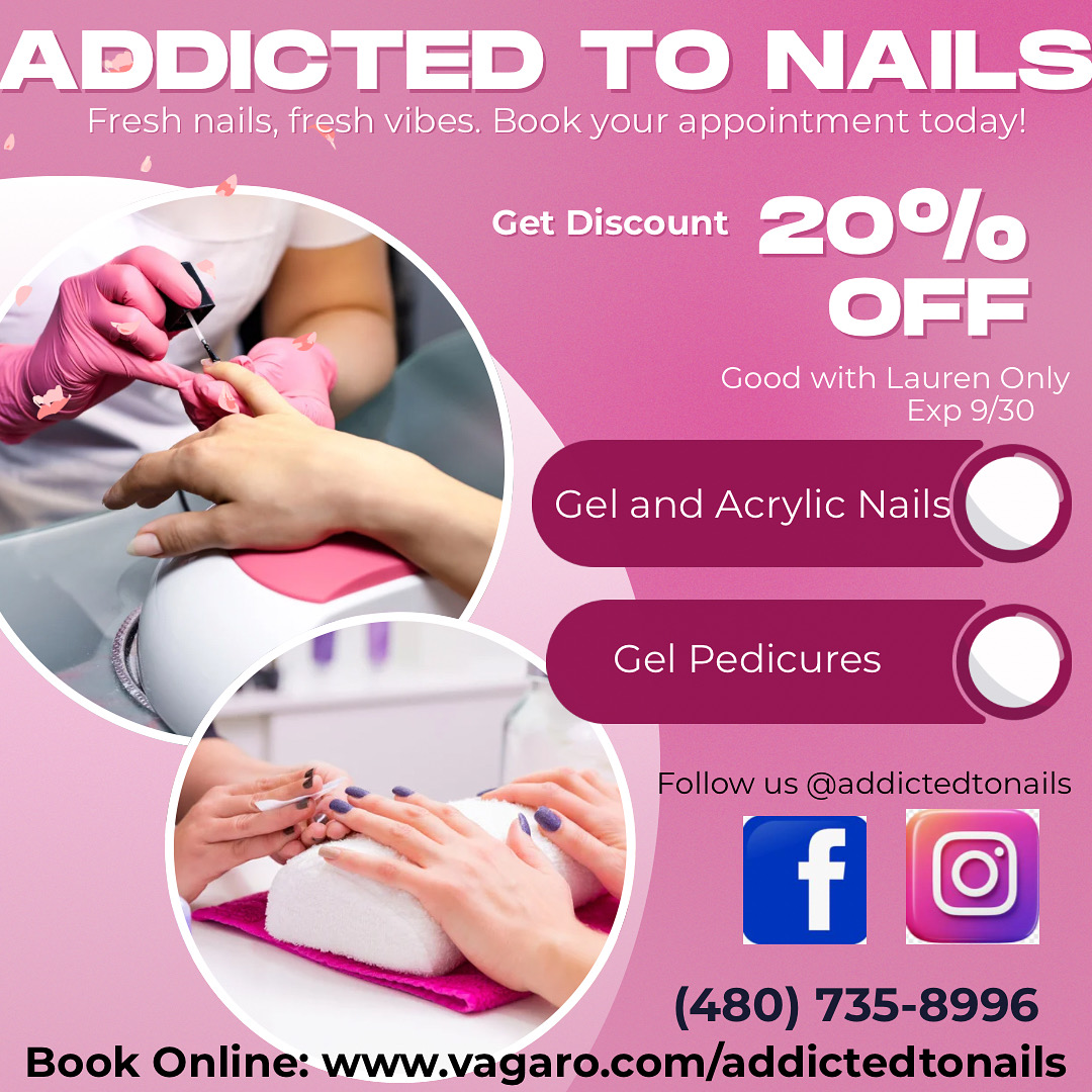 Addicted to Nails is a boutique nail salon that offers a unique and personalized experience. Established in 2004, the salon has a team of licensed and passionate nail techs who are dedicated to creating beautiful enhancements. They specialize in acrylic and hard gel enhancements, and offer a variety of nail services, including nail art designs and a signature Rockstar Pedicure. The salon prioritizes cleanliness, following AZBOC sanitation procedures, and the nail techs are committed to continued education. With over 100 gel polishes, glitters, and nail art designs to choose from, clients can expect a customized look that suits their style. The salon's atmosphere is fun and welcoming, with nail techs who are passionate about their work and dedicated to making their clients feel at ease. The shop owner is an amazing artist, and her staff is top-notch. Clients can expect impeccable work and receive many compliments on their nails. The salon is clean and inviting, and the owner, Sheera, is an absolute professional who offers many techniques and options. New clients can enjoy $10 off their first visit.