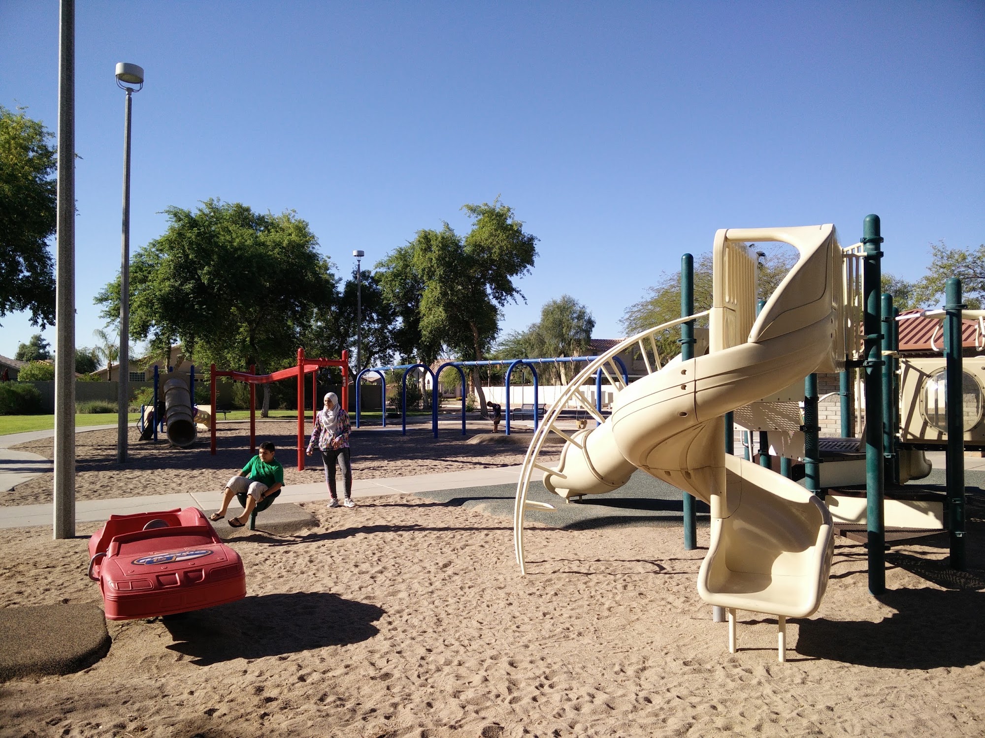 Clean little neighborhood playground with a large field and shady trees.There's a zipline, but no swings.Lots of space to set a blanket down for a picnic.