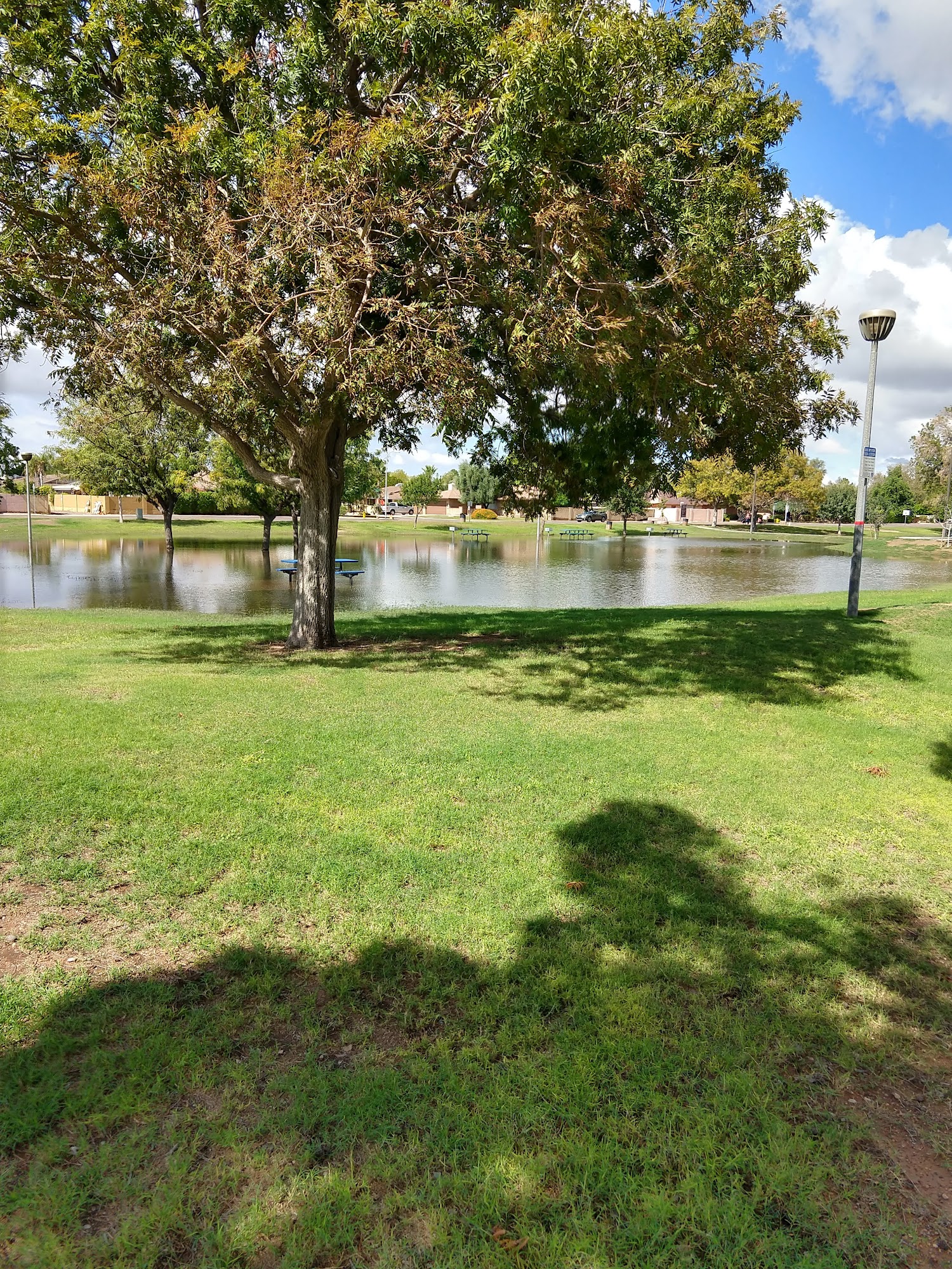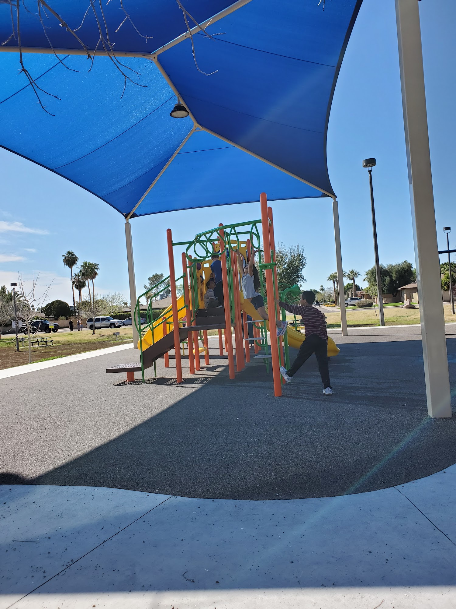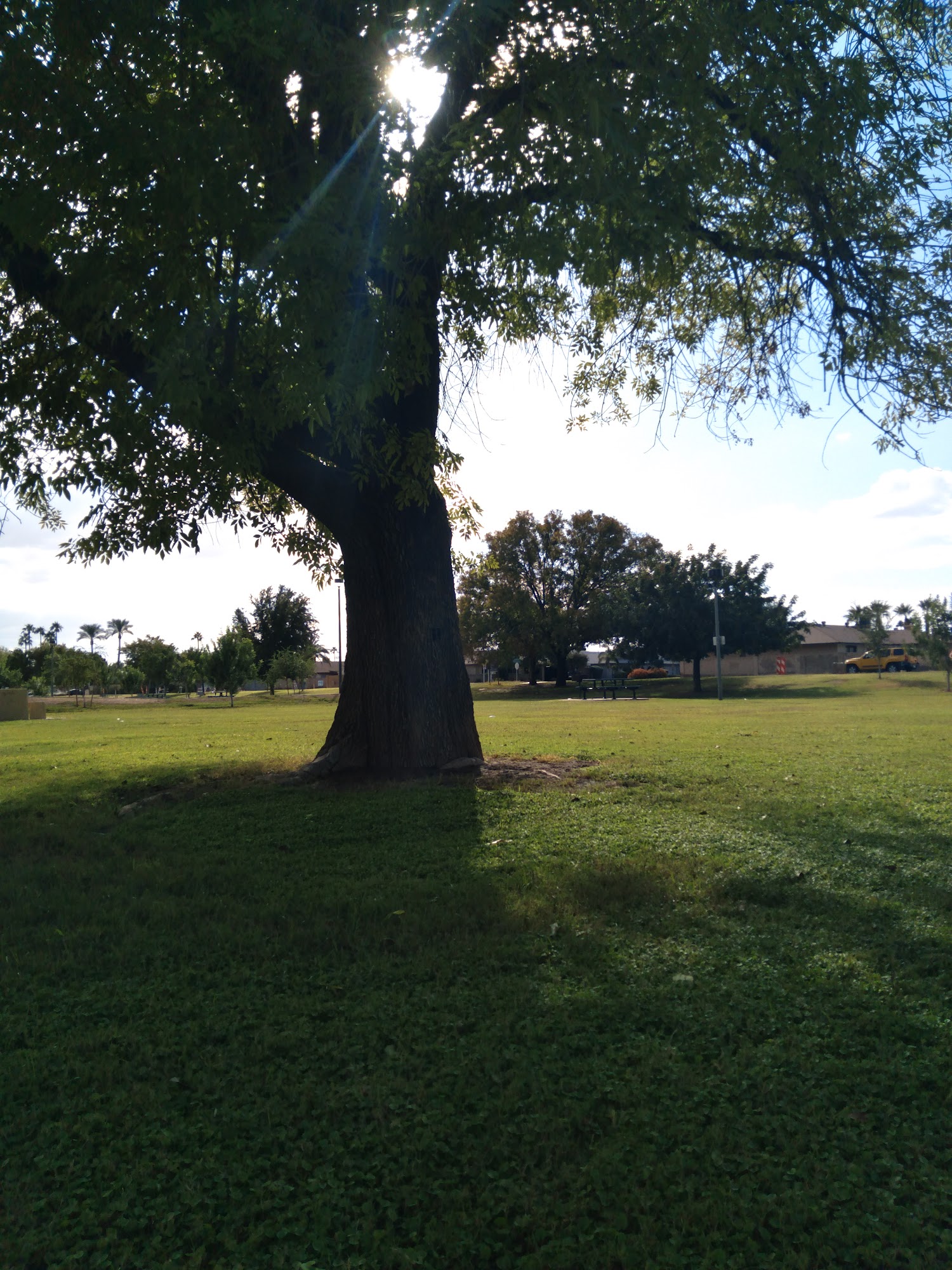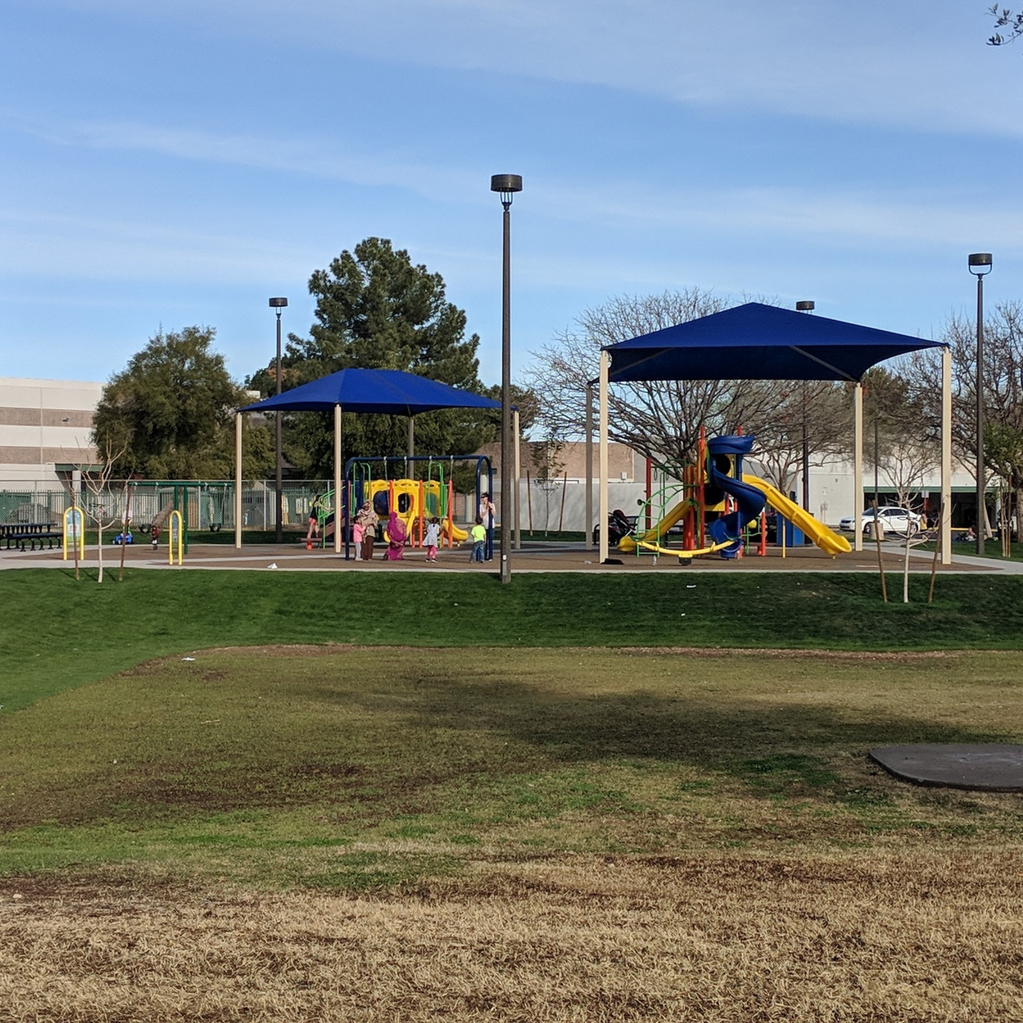 Great neighborhood park with lots of shade and tables with grills. No restroom, so plan accordingly.Playground: New playground a few years back, starting to show wear and tear as well as being vandalized.Picnic area: Several tables with shade structure and garbage/recycling.